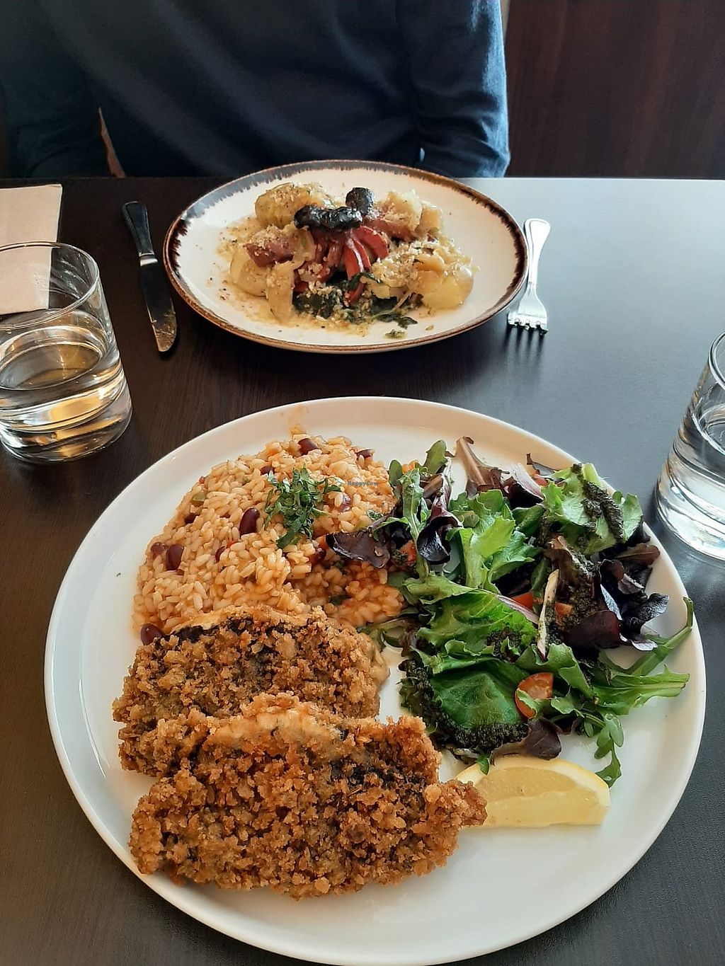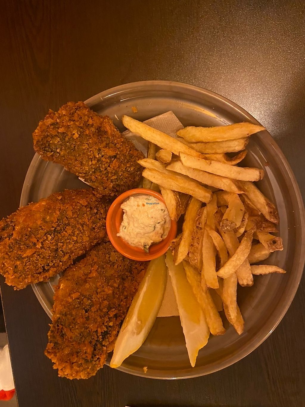 Fried vegan fish and rice with beans