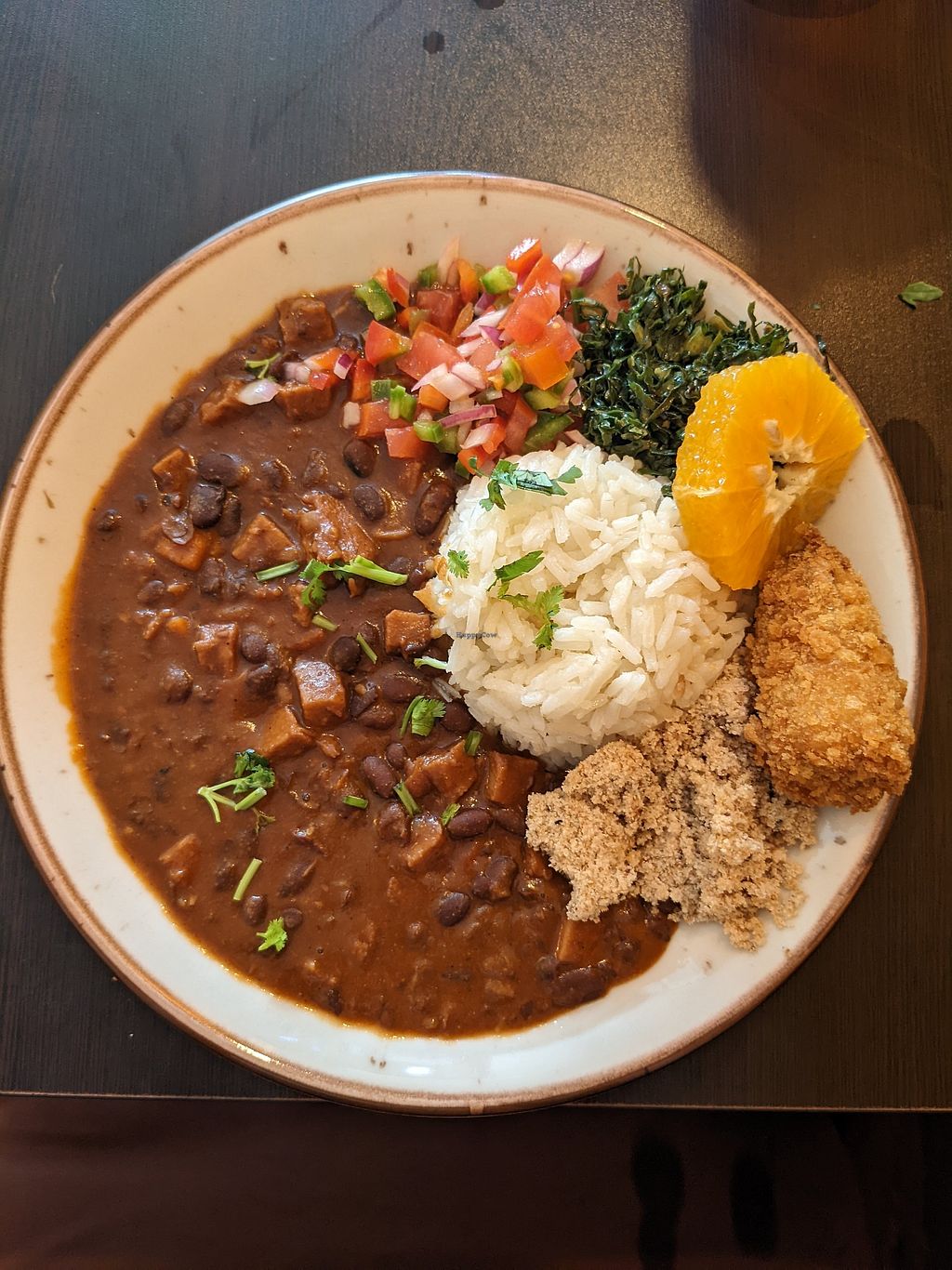 Vegan fish, rice with beans & salad with some iced tea