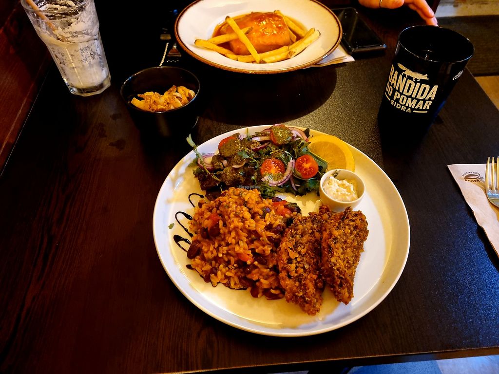 Peixe com arroz, tomate e feijão. Já comido um pouco porque estava mto…
