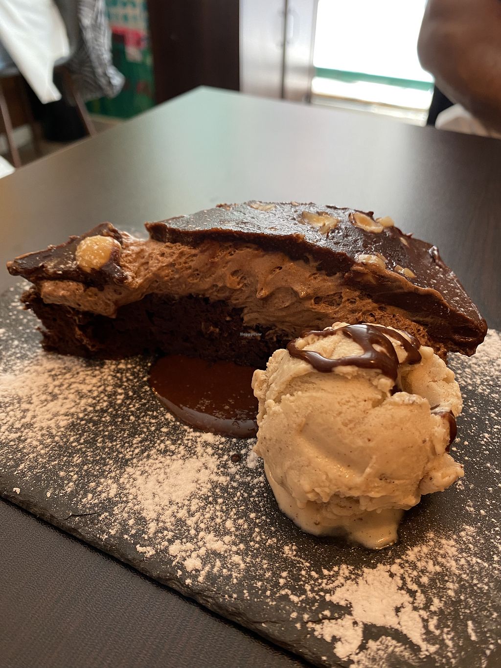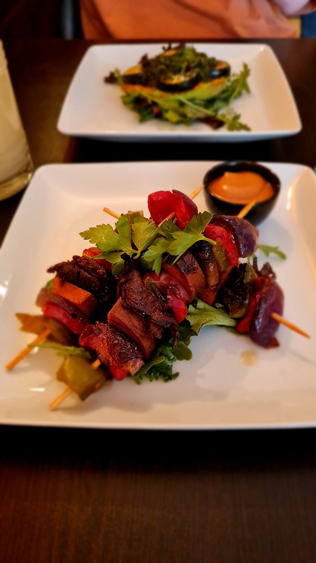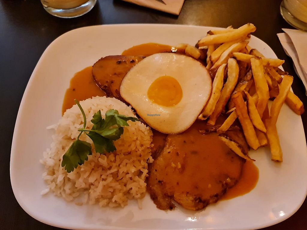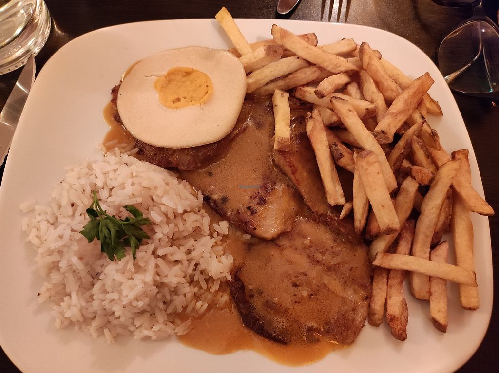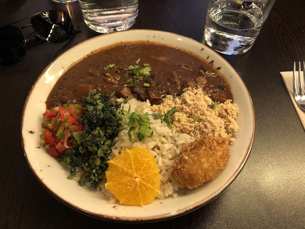 Dish of the day: Seitan stew, rice, beans, fried plantain and spinach.…