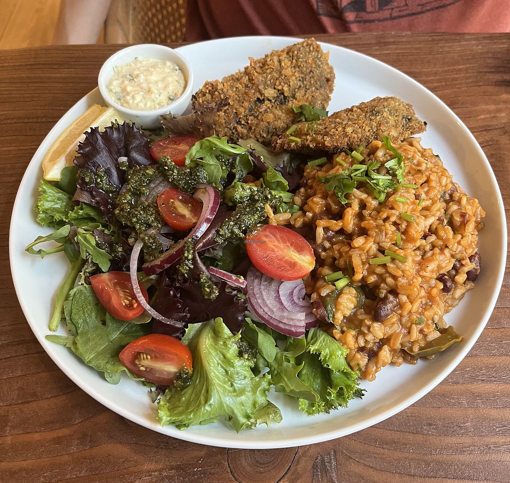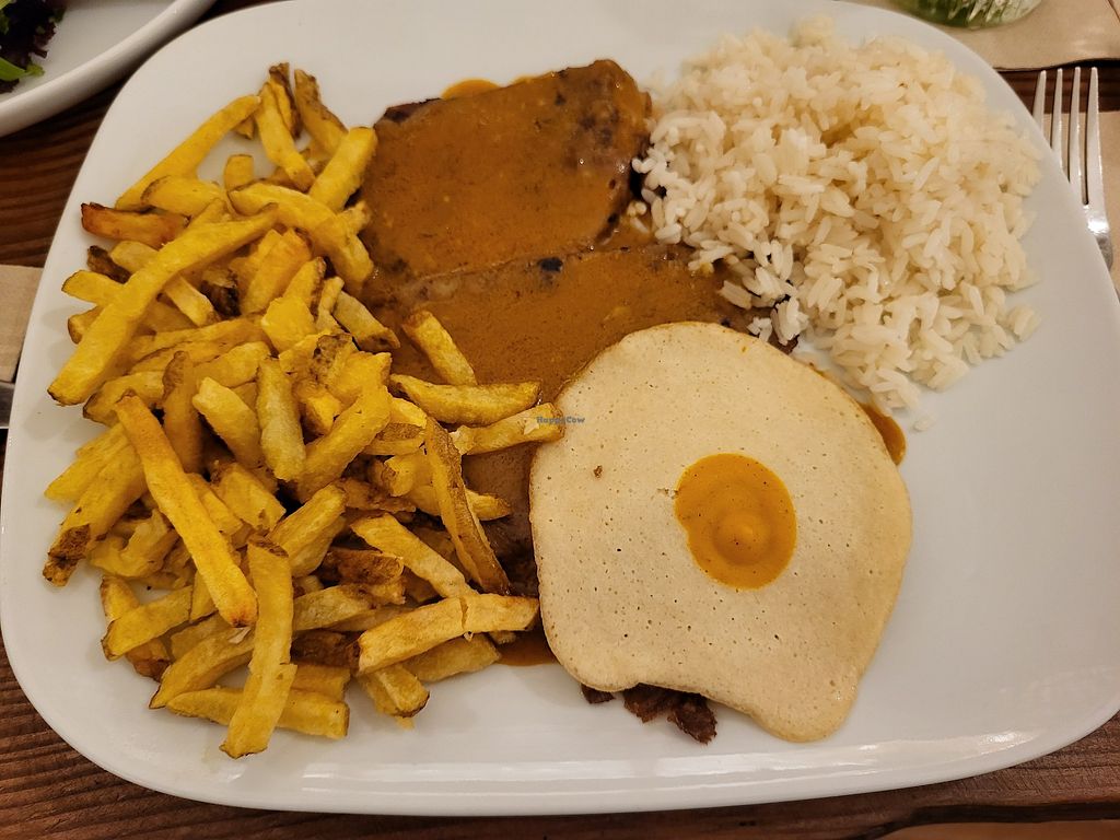 Botoque! Seitan steak, white rice, French fries, vegan egg and mustard…