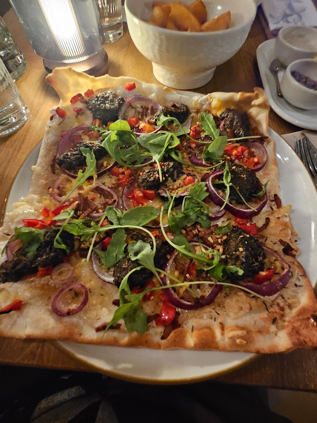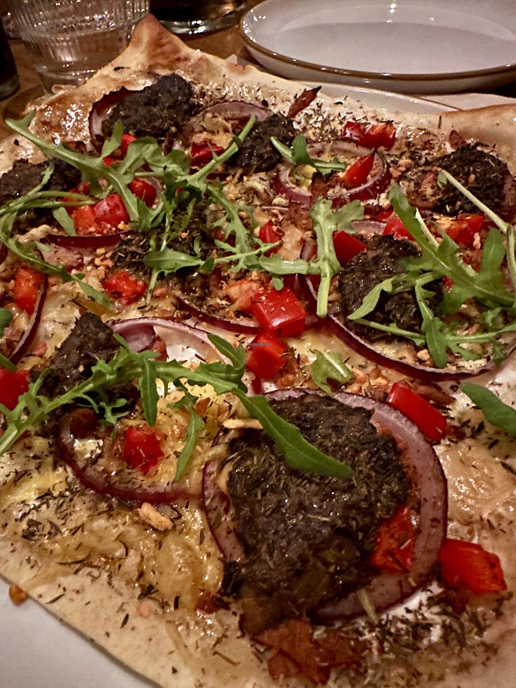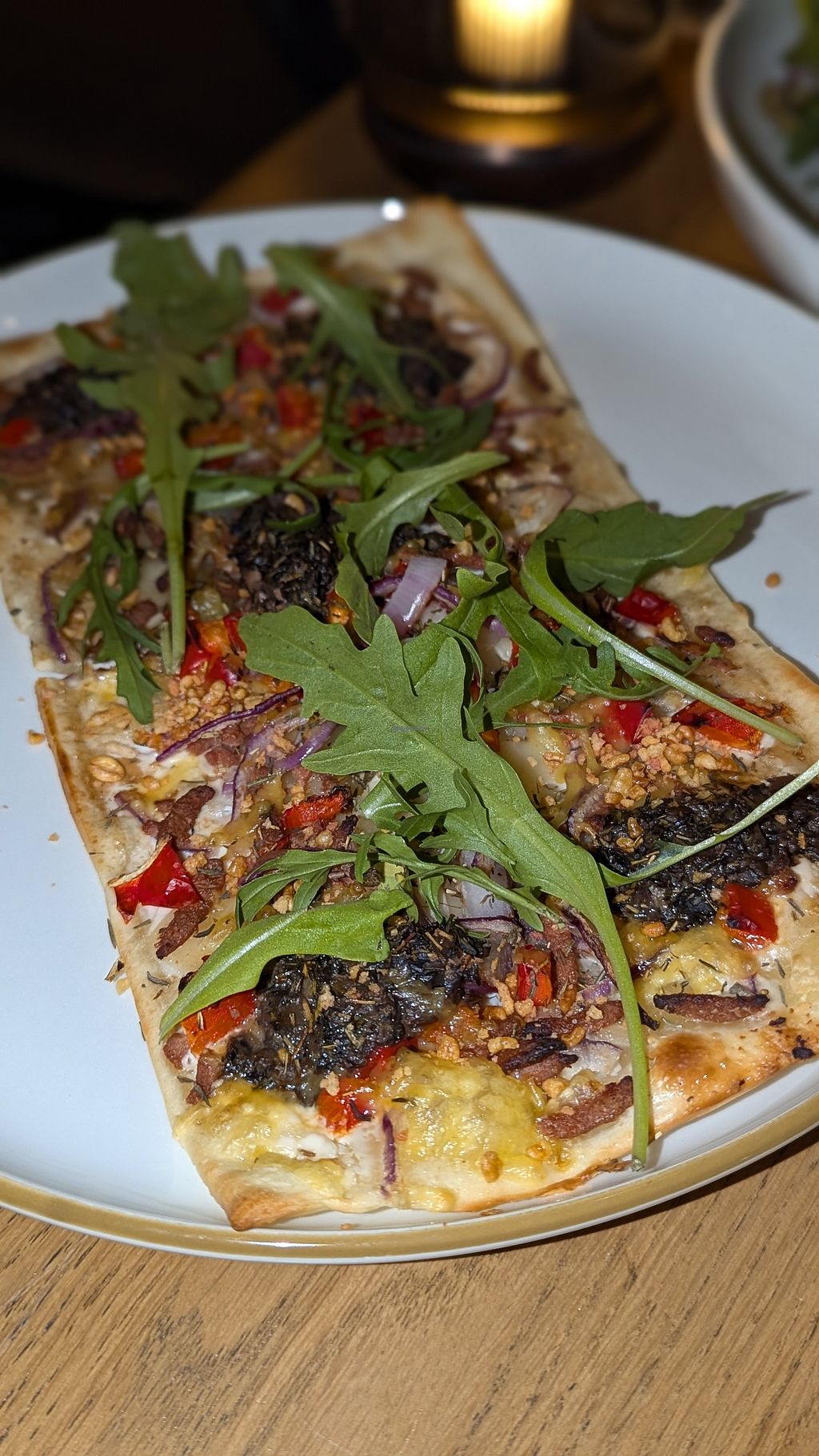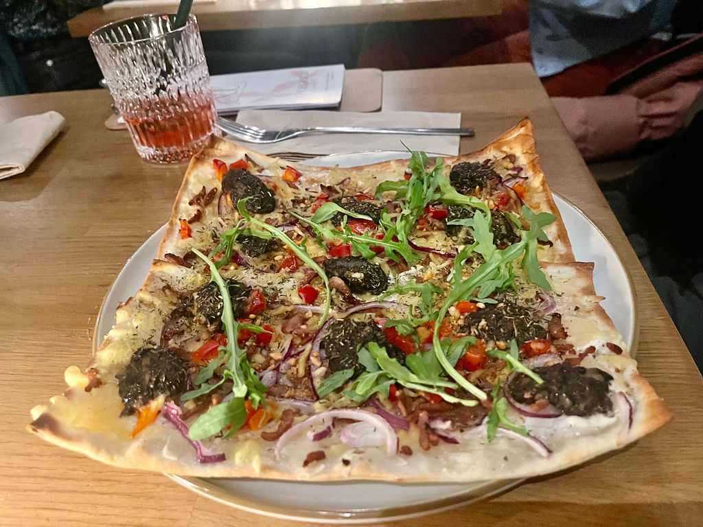 Hoofdgerecht: Flammkuchen mit 'schpeck' en truffelsalsa, zoete puntpap…