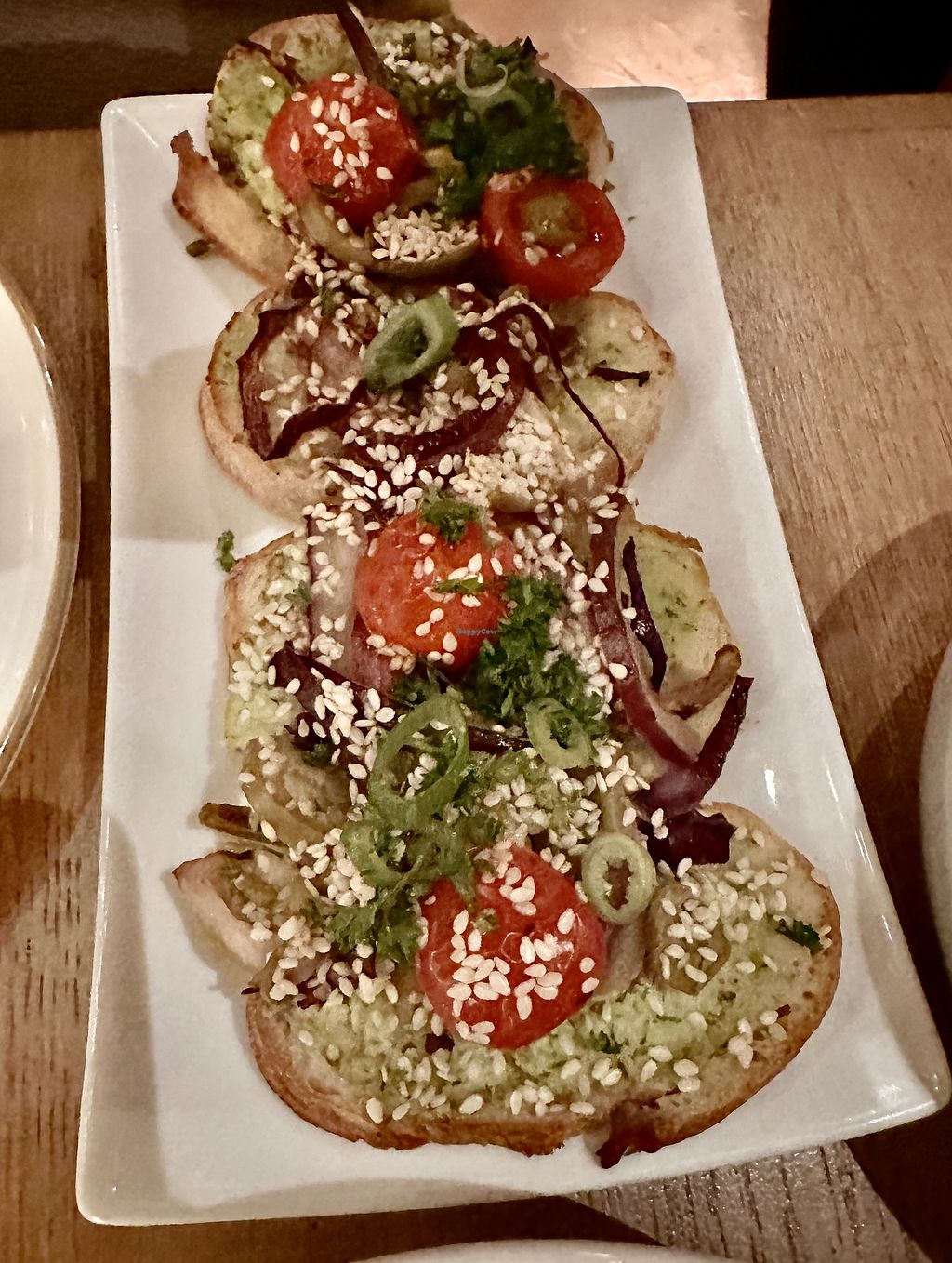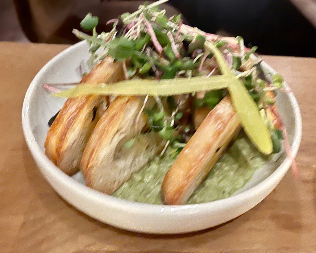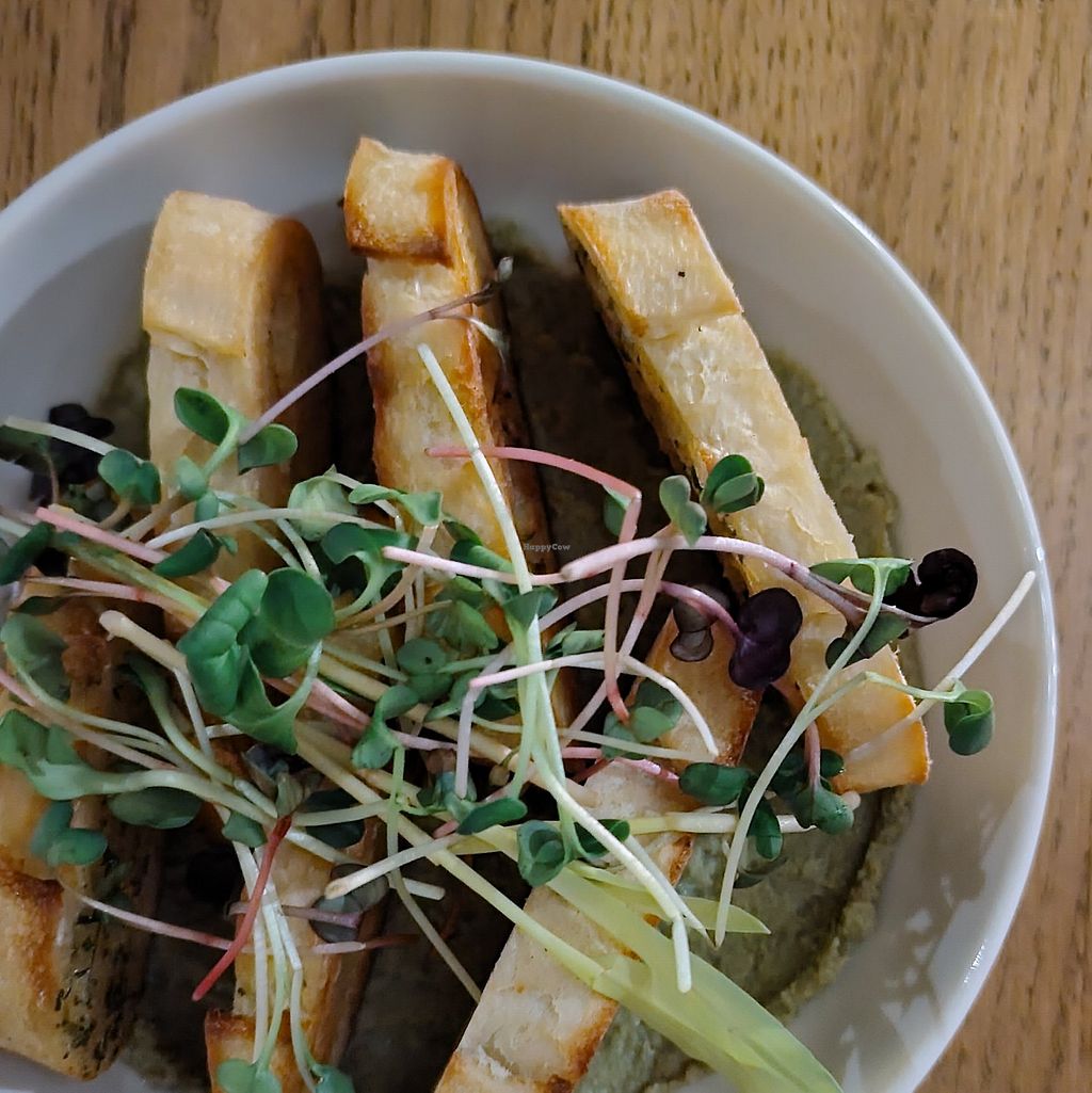 Tapas koud: Artisjok/basilicum dip met kiemgroentjes en geroosterde lo…