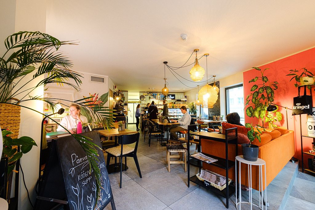 Estonian potato salad, Orange matcha (in wine glass) and Turmeric latt…