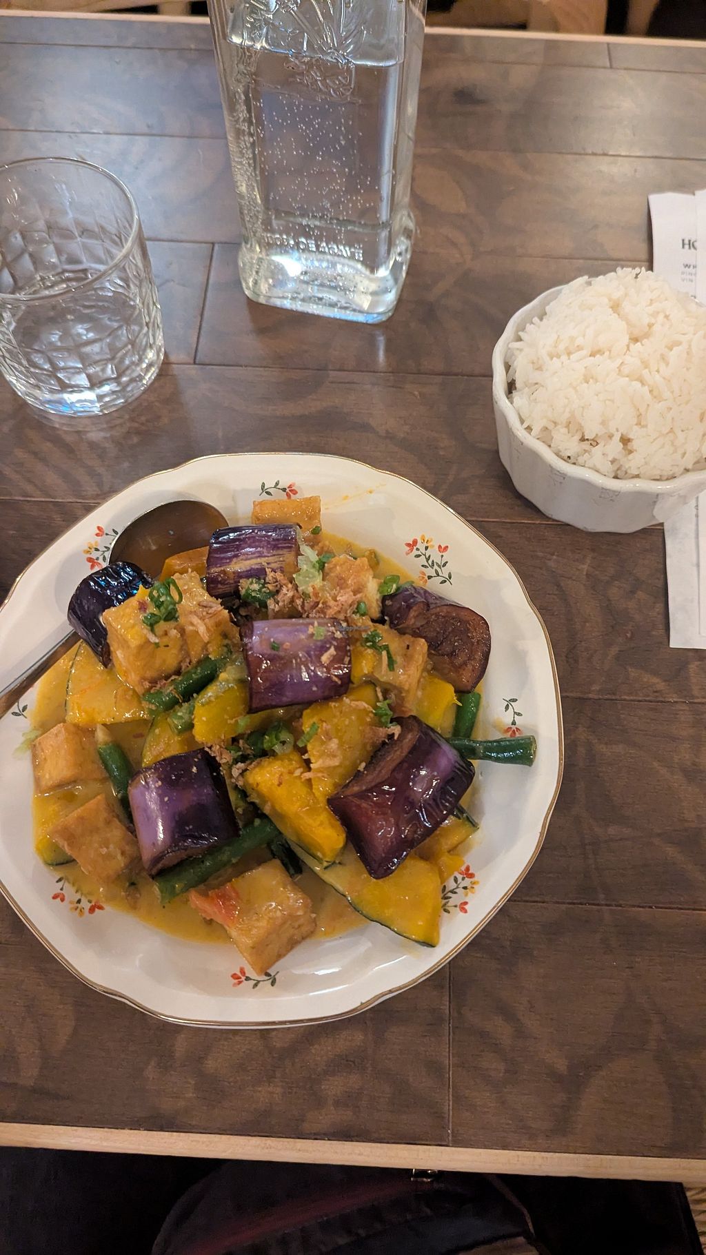 I think this might have been my first time trying Filipino food, but it for sure won't be my last. I didn't see a separate vegan menu as others mentioned, but there was a label on the menu for "vegan options available," and the waitress explained to me what exactly that entailed for each dish. I ended up getting the squash coconut curry with green beans, eggplant, and—by my request—tofu too. I got it with a small side of rice. This dish was nothing short of heavenly. Everything was cooked to perfection, and I could drink the coconut sauce. Also the portion size was huge. Definitely meant for sharing. I took 2/3 of my meal home.
