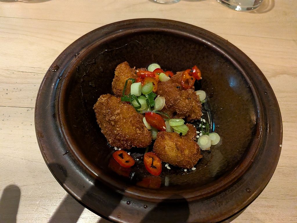 We came for dinner, so the menu was quite different than in the description above. We got a burriata and dim sum. The burriata was good, but the dim sum were disappointing, and both portions were appetizer-sized. This was annoying as we asked the server specifically whether the portions were large or more like tapas. I wouldn't recommend coming for dinner unless you already ate.