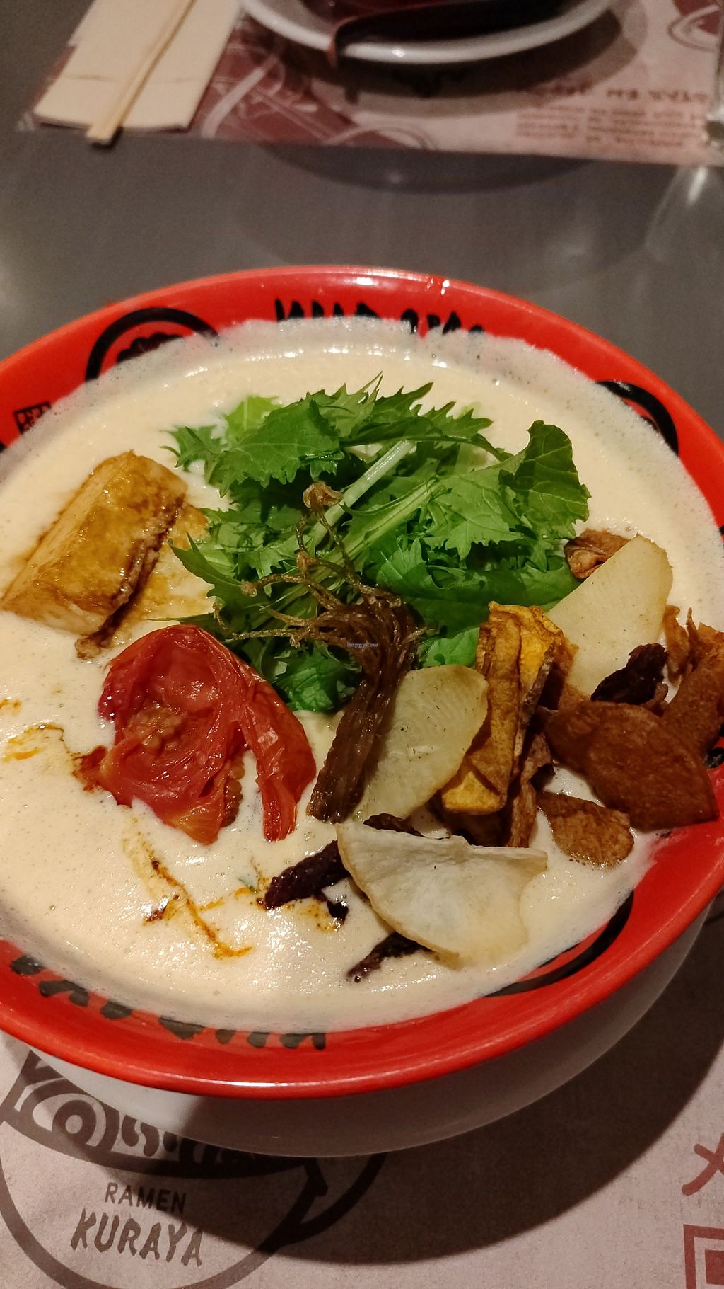 Read moreThe tantan ramen was fine, the broth is soy milk based and a bit of chilly oil is added on top. Not very elaborate. For some reason they added sweet potato chips on top instead of veggies, which got soggy immediately. A couple big chunks of tofu added, but the way it was breaded it separated and you end up with lumps of flour in your soup.