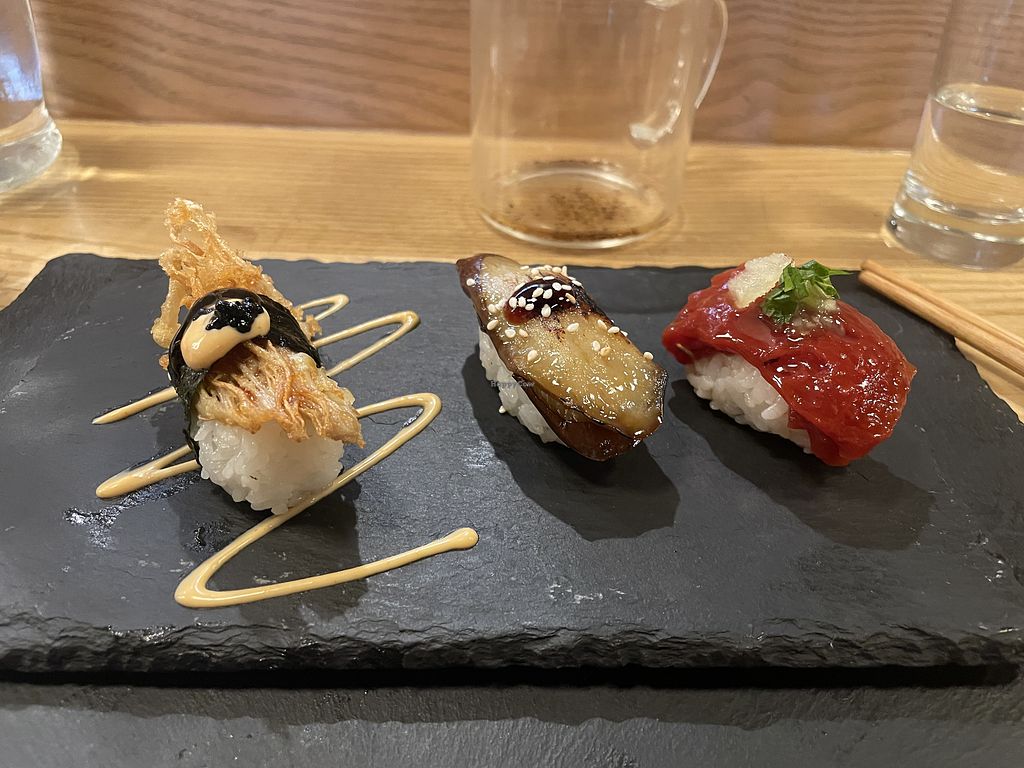 Food was incredible! We had crispy avocado rice, portobello fries, squid nigiri, trumpet mushroom nigiri, & king mushroom roll. Everything was 💣!