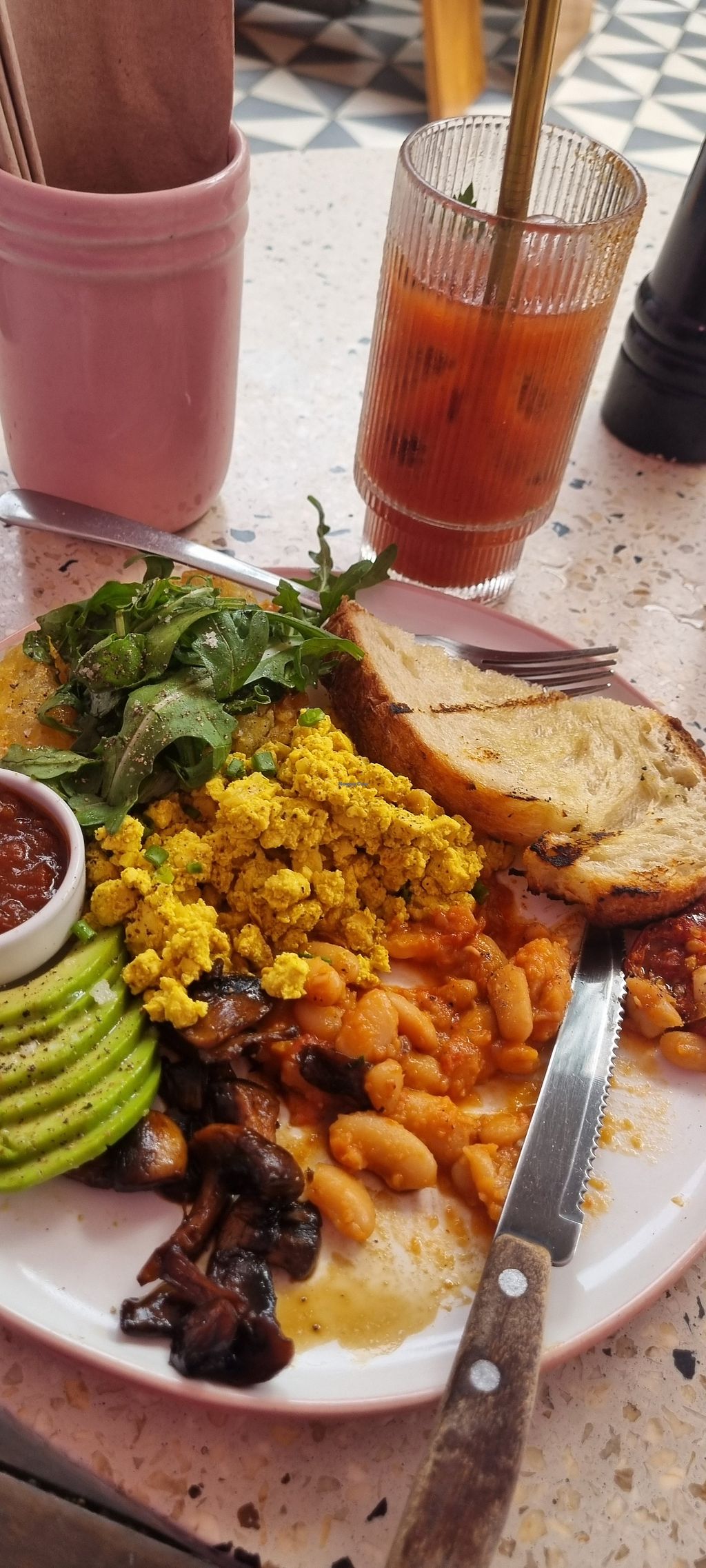 Great atmosphere, friendly staff, fantastic all plant based menu 🌱 I had the Paradise Pancakes and my partner had the Big Breaky. Both delicious and artfully presented. Coconut mocha and protein smoothie were also yummy! Highly recommend.