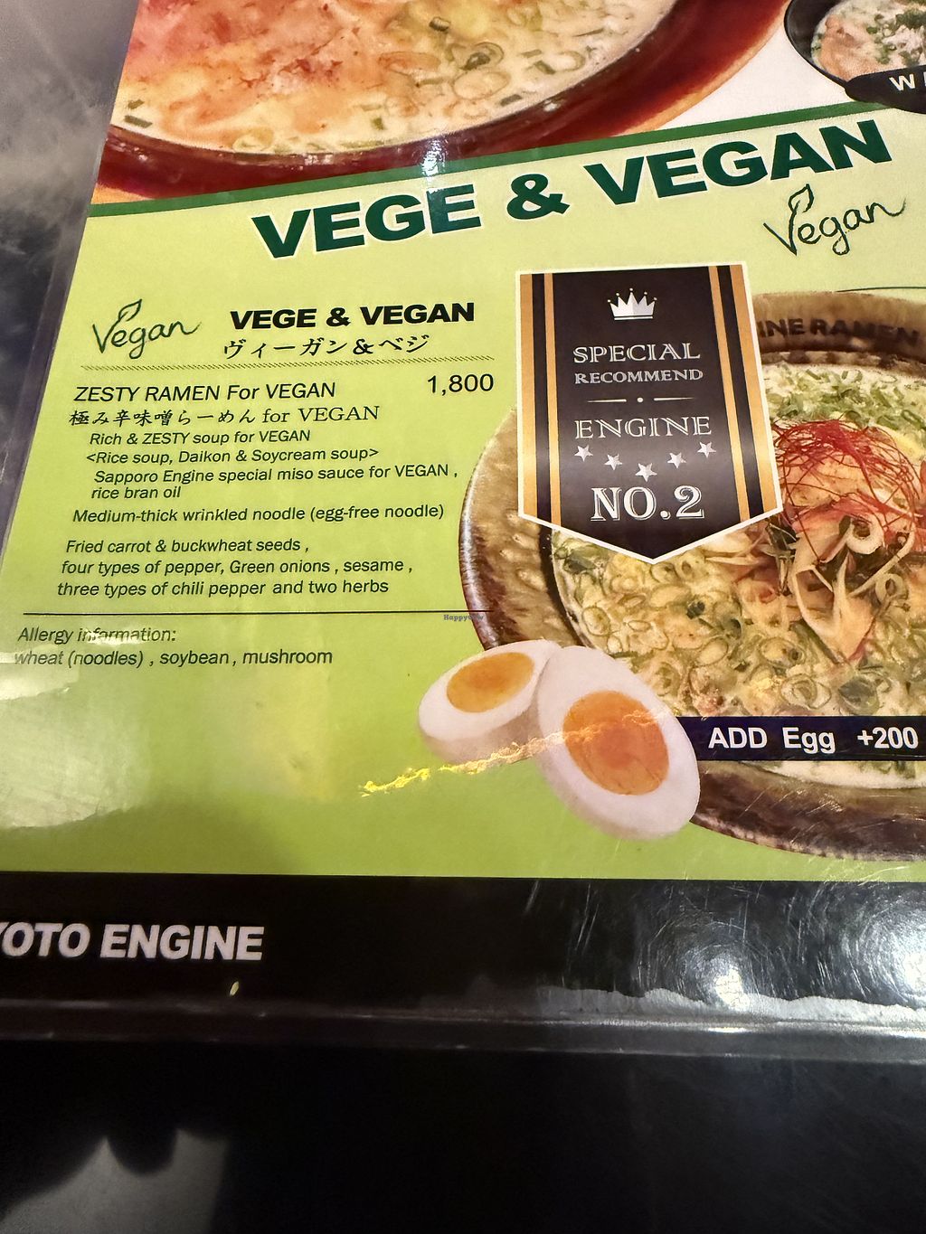 Due opzioni di VERO ramen vegane. Porzioni super abbondanti. Prezzo nella media. Anche i ravioli hanno opzione vegan. Molto attenti e rapidi nel servizio. Parlano un inglese comprensibile (non scontato in giappone) mancano i dolci