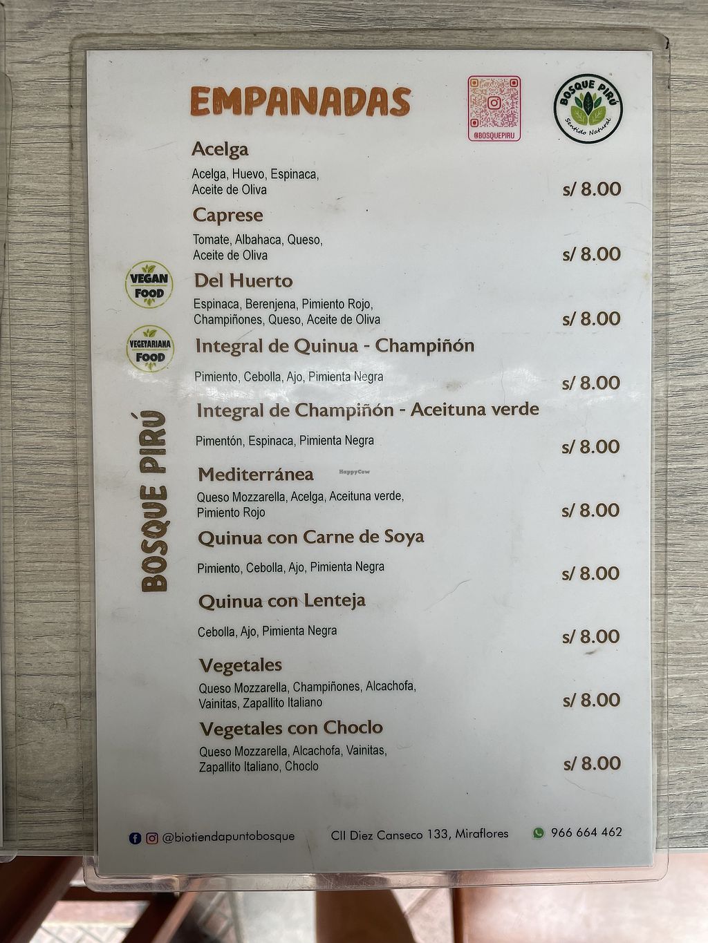 This place is a kiosk selling health/natural items and offers a few empanadas and cake-breads. I had a vegan empanada and it was nice. This is somewhere to grab a snack, not a meal. Empanada was 6 soles.