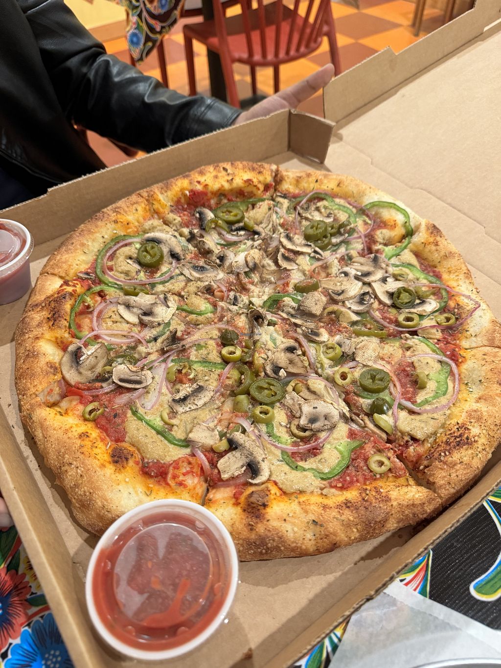 Really, really delicious pizza! They make their own sunflower seed cheese in-house, and it’s absolutely incredible—it truly makes the pizza special. The flavors are so fresh and balanced. They’re usually very busy, so plan ahead when ordering. I do wish they’d improve the wait times though—once I ordered ahead with a 45-minute estimate and ended up waiting an hour and fifteen minutes for my food.