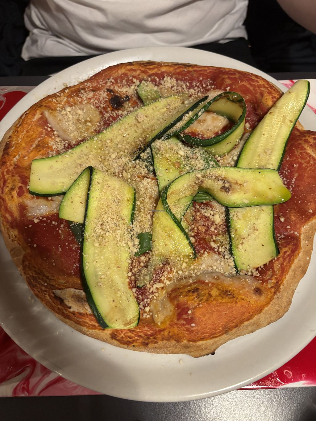 The food was nice but not as special as the price led us to expect. Overall we were a bit disappointed. I had a pizza with homemade 'mozzarella' and blue cheese. It was a decent pizza and the blue cheese was tasty. My partner had a risotto made with brown rice, macadamia cream and courgette/courgette flowers. Again it was tasty but subtle in flavour and it wasn't creamy. We also shared a truffle cacio bruschetta. It was enjoyable but seemed quite basic - a runny, truffle-flavoured sauce on toast. All the meals felt like they were missing components and could have been improved by some garnishes to provide a bit of variety in flavour and texture.