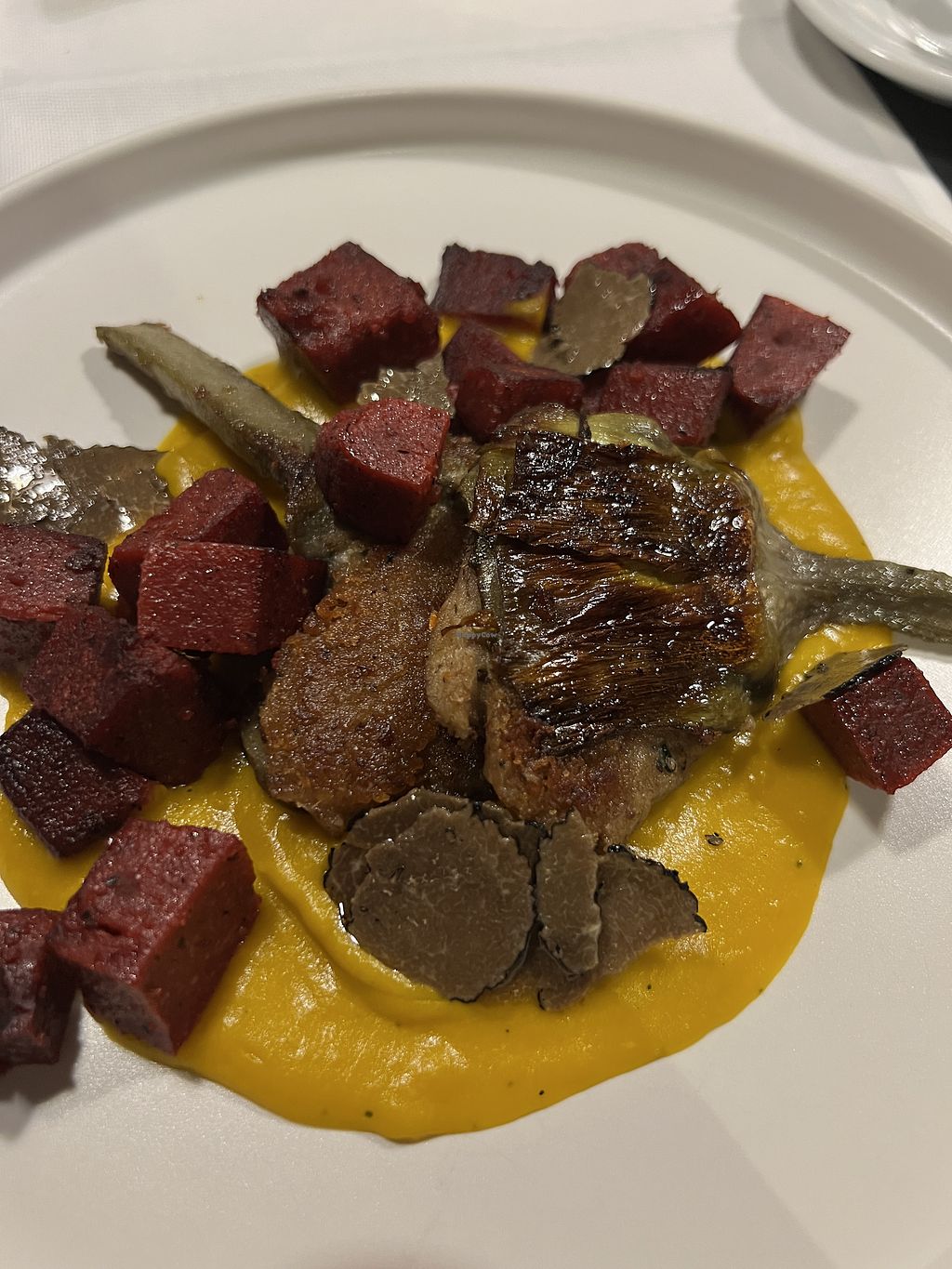 ravioli ripieni di yuca e batata, su cremoso di cime di rapa e broccol…