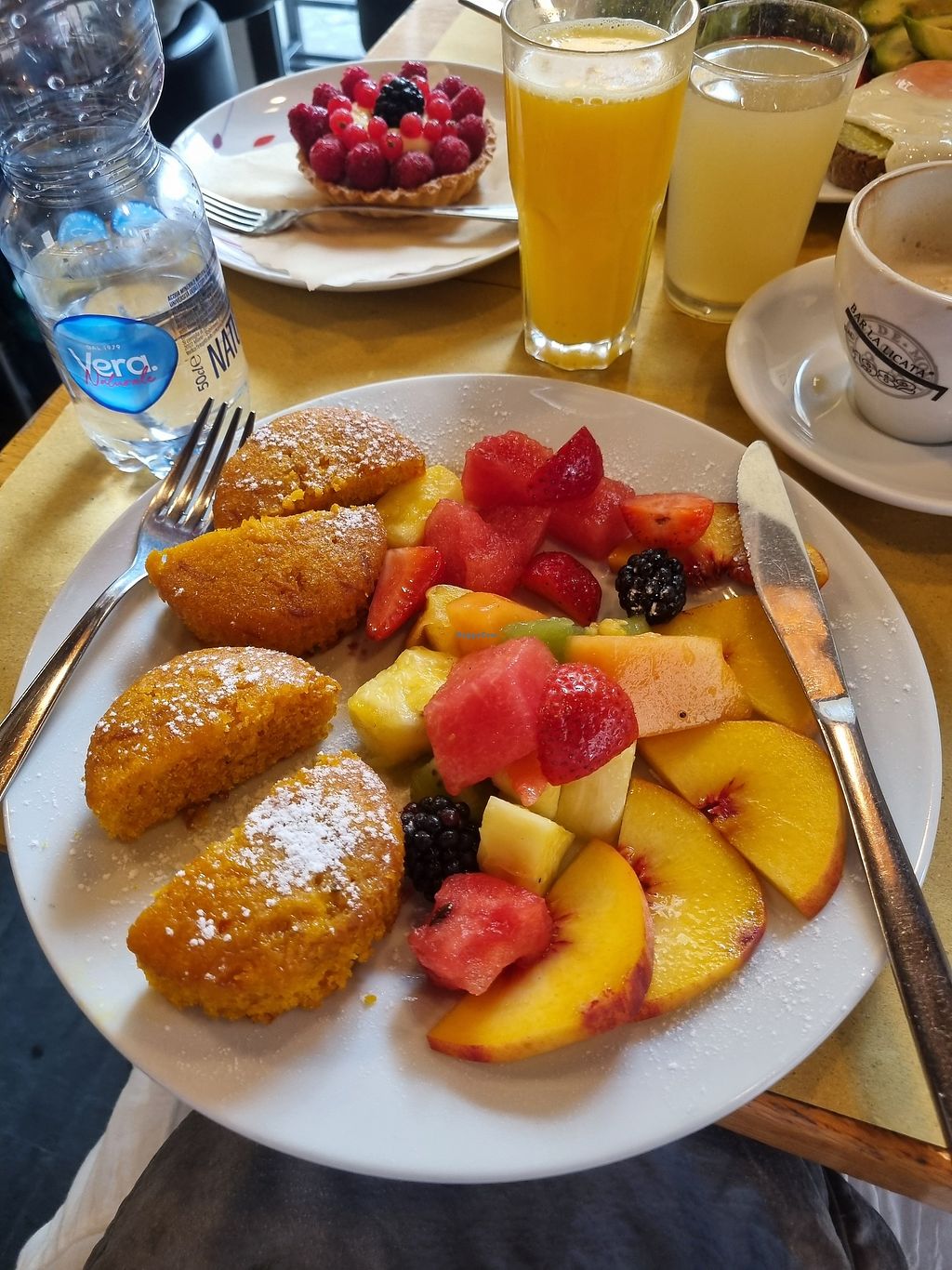 The staff was so friendly and able to guide through the menu to the labeled vegan breakfast that included a croissant, cappuccino, corn muffin, fresh fruit and orange juice.