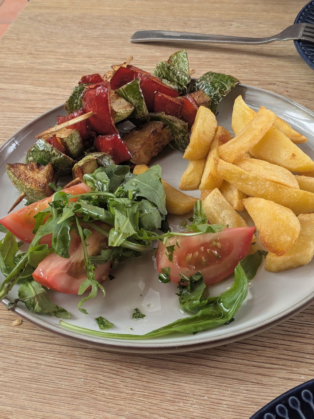 Perfect location. Some vegetarian and vegan options on the menu. We ordered zalouk and papas arrugás for starters. Zalouk was so tasty, but portions are so tiny (5 potatoes with a little bit of sauce). As a main dish to share we took the vegan poncho moruno. 12 euros for roasted zucchini and pepper bits with fries. Little beer 3 euros. It is good to have these options but I think you can find a better place. WC are disgusting.