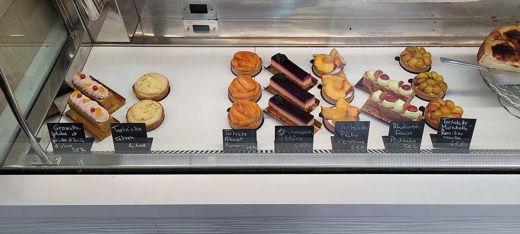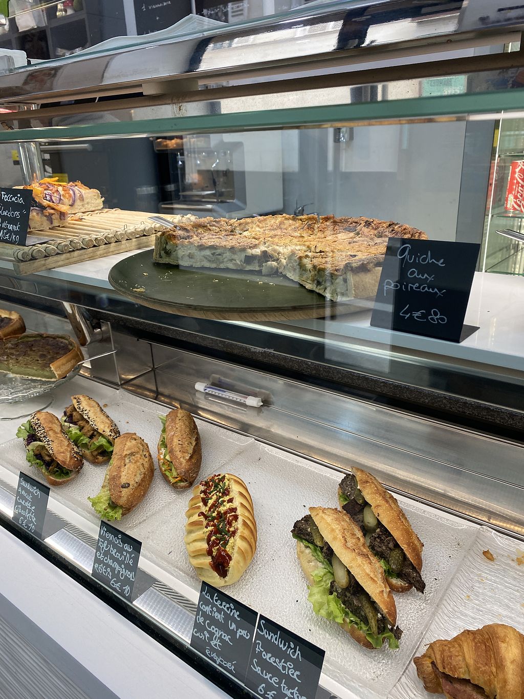 Great choice of sweet and savoury vegan bake goods such as filled baguettes, quiche, foccaccia etc., pastries, breads, baguettes and many others. There's a nice little park nearby where you can sit on a bench and eat.
