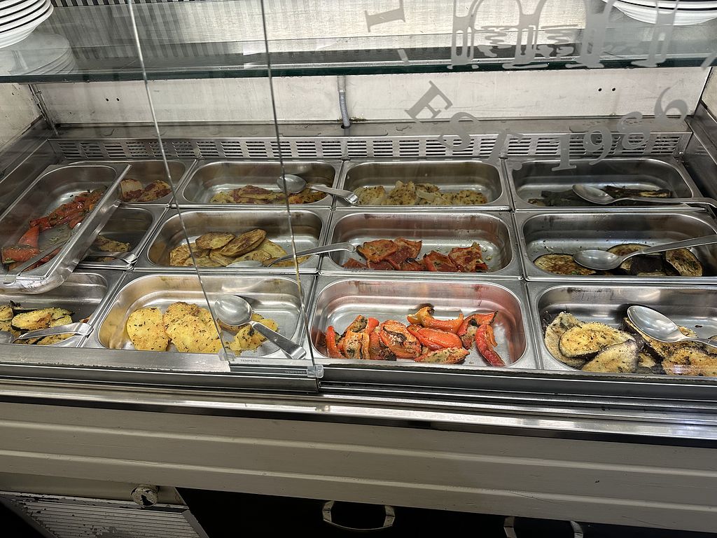 Serves meat, vegan options available. Typical Roman pizzeria est. 1986, buffet of grilled, gratin, marinated vegetables (aubergines, potatoes, onions, courgettes, peppers), plain bruschetta, tomato bruschetta, pizza marinara, french fries, penne all’arrabbiata, Roman broccoli, chicory, mixed salad, roast potatoes, artichokes Open Mon 12:00-00:00, Tue 12:00-12:00, Wed-Sun 12:00-00:00.