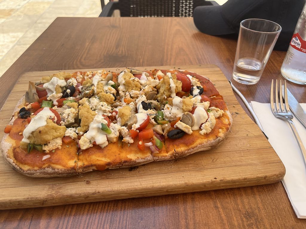 In a vibrant busy location with outdoor seating. The vegan options are clearly marked. The pizza was very good (with tofu and ground almonds as part of the topping). It wasn’t the most amazing food, it was okay. Good place to come if you are with non vegans and need a compromise.