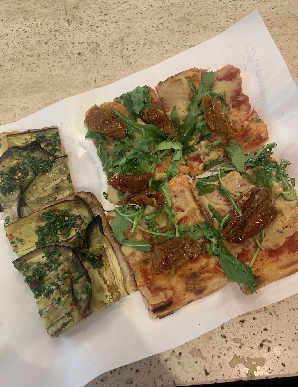 They usually have two vegan options, but each time I went there I saw the last piece of one of the two being snatched up by the person in front of me... So I had one very delicious tomato sauce/mushroom one, and one with eggplants (no sauce) which was good. The dough was super crunchy and the staff very friendly. You can decide yourself how much pizza you want to eat and you pay by weight.