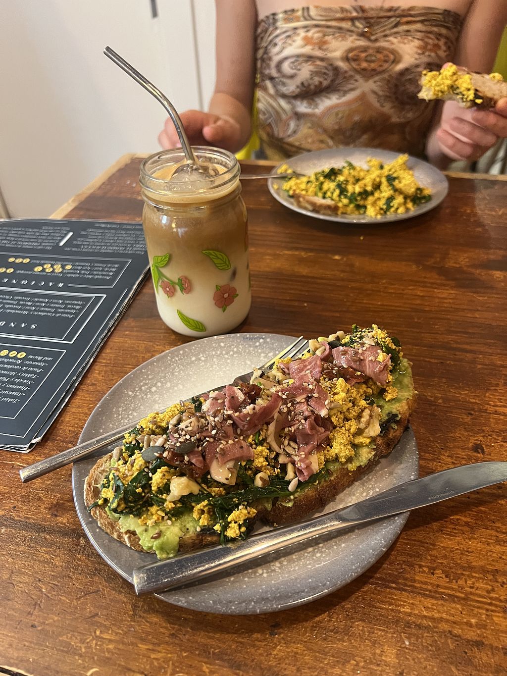 I ordered the dirty chai latte and it was the best coffee I've had in a looong while. We also ordered the toasts with scrambled tofu, avocado, walnut and bacon(/cheese) and really loved it. So tasty and filling.