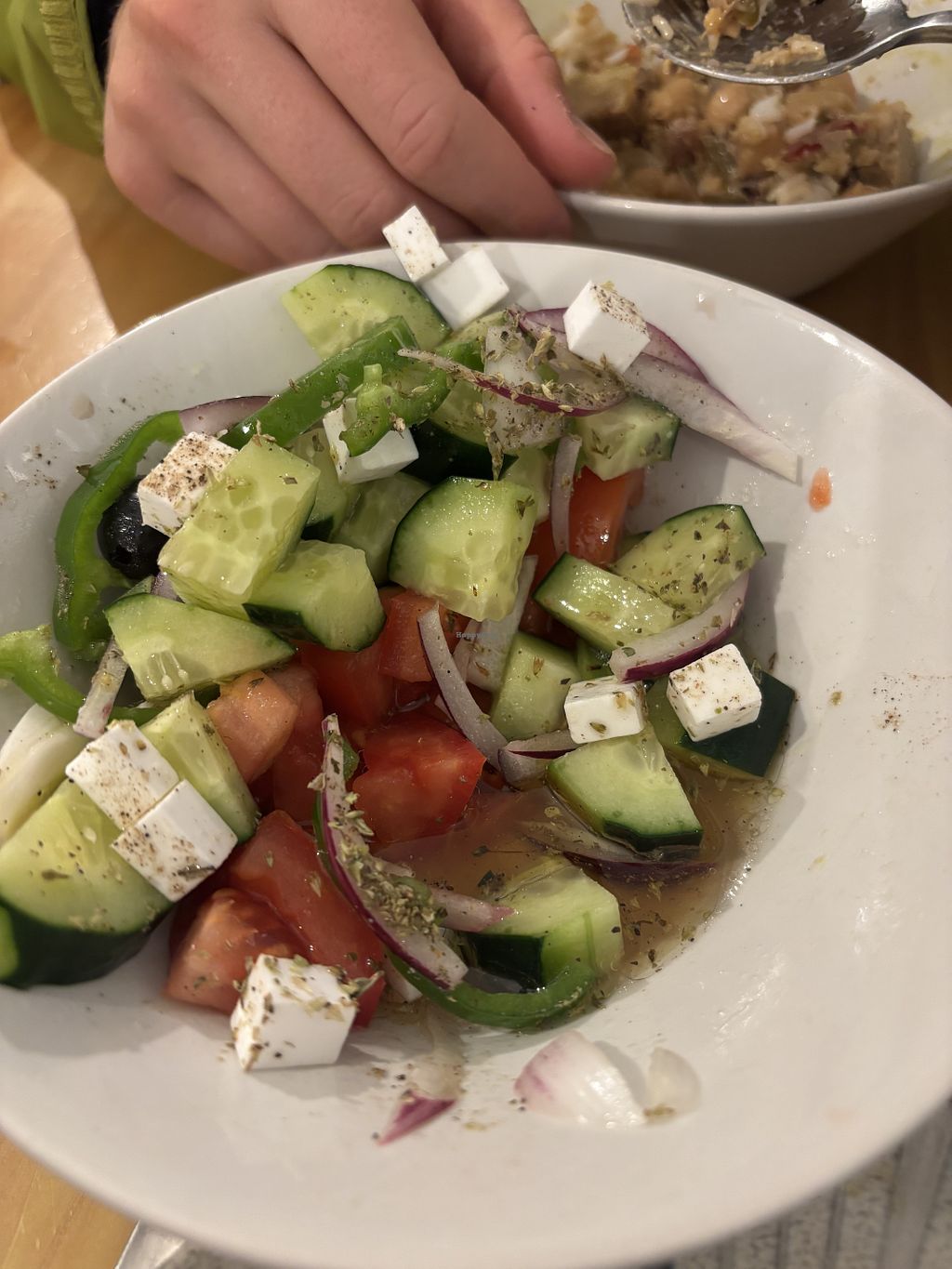 Wir hatten eine Auswahl verschiedener Dinge (Hummus, „Fisch“, Aubergine usw.) und alles schmeckte sehr gut.