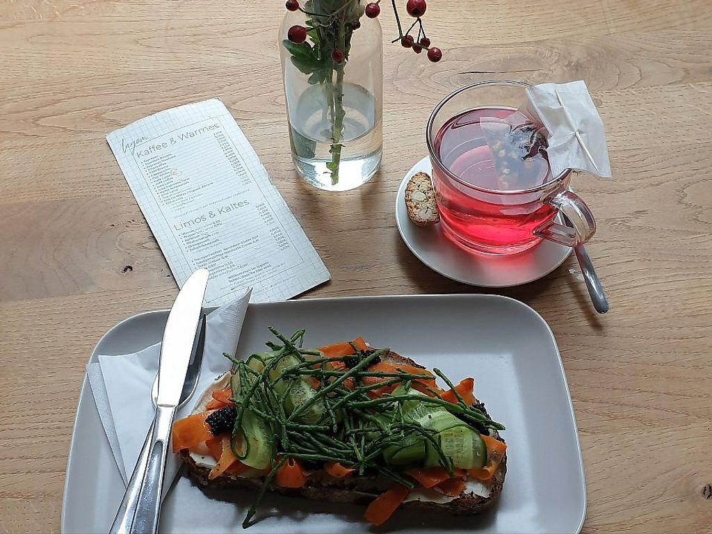 Das Lagom ist ein kleines Café im schwedischen Stil und bietet neben Getränken diverse süße Backwaren und belegte Brote (Smörrebröd) an. Für meinen Geschmack hätte das vegane Lachs-Brot etwas "fischiger" sein können, aber es war dennoch lecker, optisch ansprechend und mit dem Queller sowieso toll. (Queller wird viel zu selten angeboten, finde ich.)