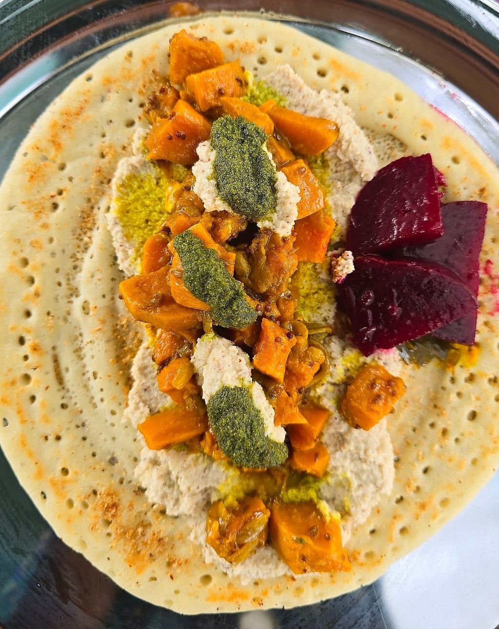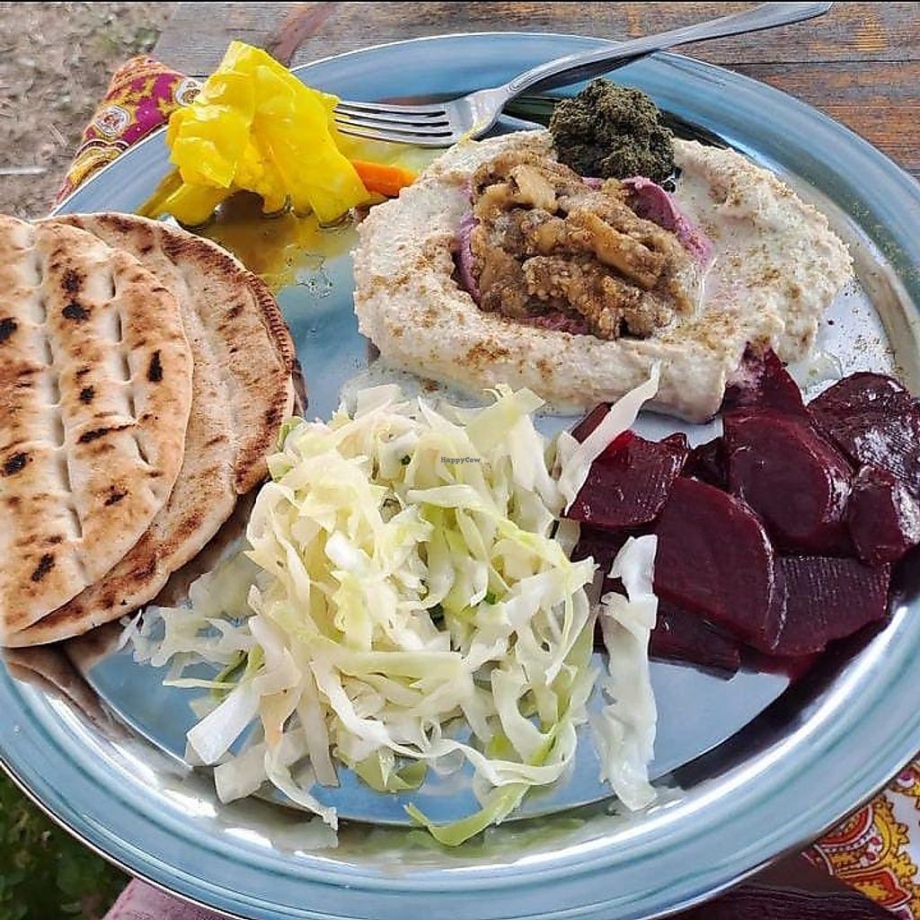 Great flavours, variety, beautiful colours and beautifully presented! We keep returning because it is so nice to have a fully vegan place! And the hummus is to die for! Very relaxed atmosphere, with a little clothes swapping area and chill seating underneath the trees! We shall ofcourse be back!