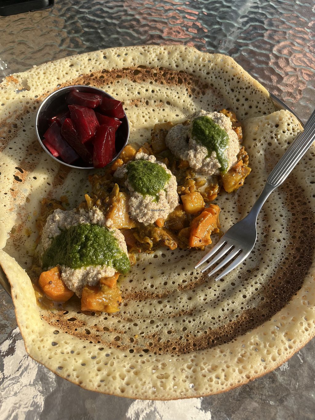 I shared the meditteranea plate with my husband. It was enough for us two. The Falafels were out of stock but we get humus as exchange. All on the plate was very very delicious! We also got the Ginger Ale which was also really great! The atmosphere was Cosy and chilling! Totally recommend!