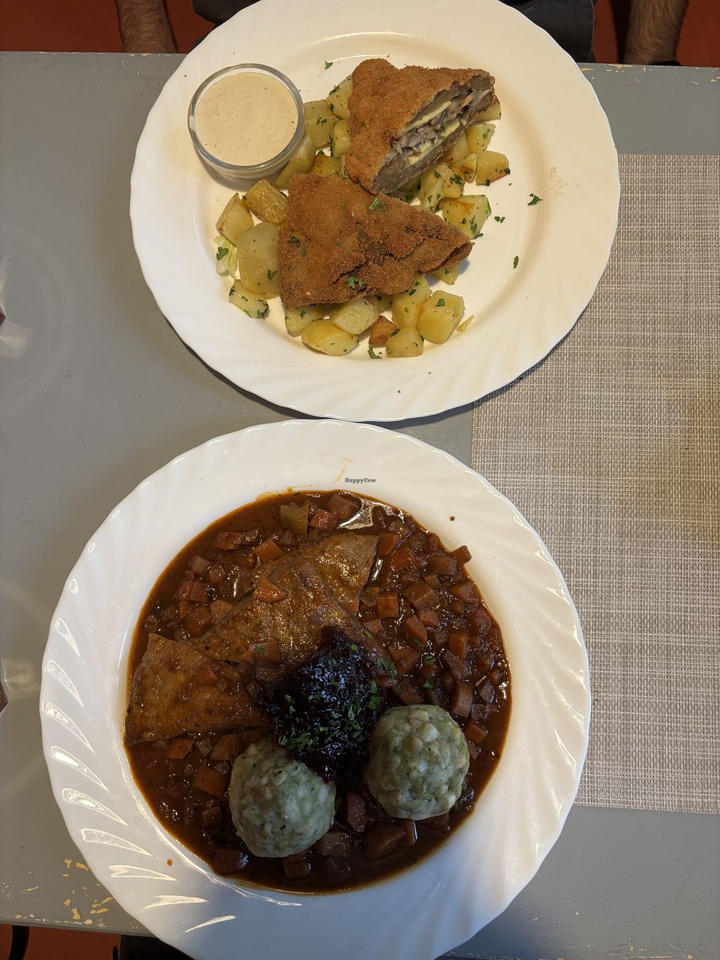 Seitan Schnitzel mit Bratkartoffeln und Sauce Tartat und Seitan-Gulasc…
