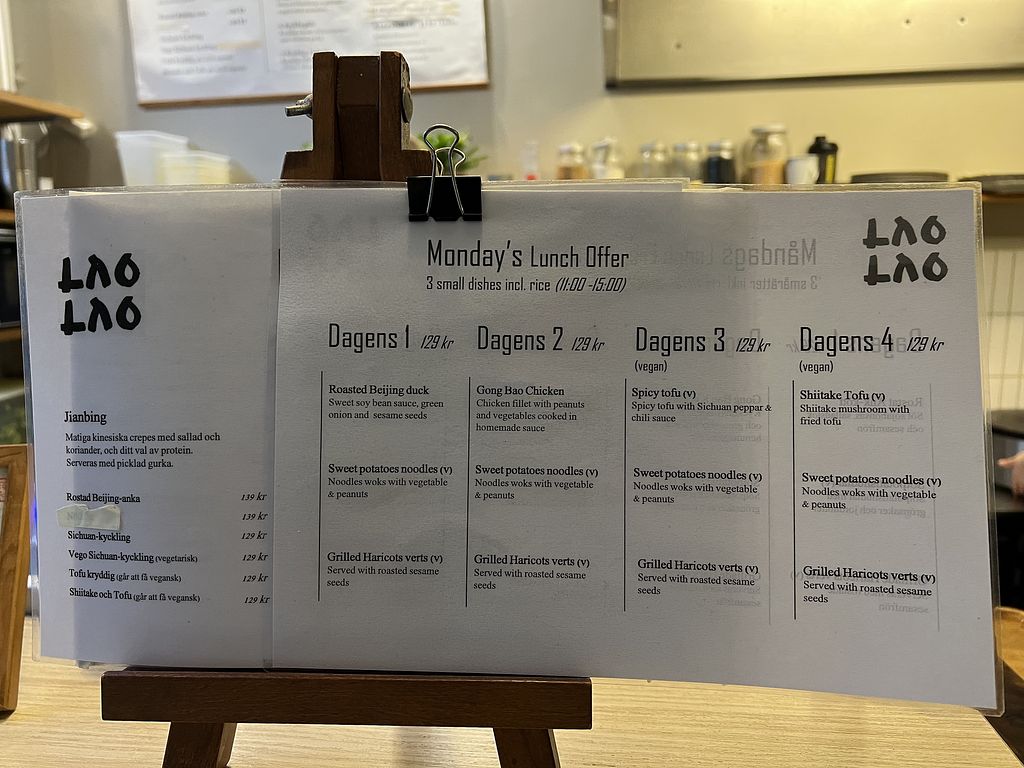 Serves meat, vegan options available. Chinese food menu with some vegan dishes and other ones that may be upon request - ask staff. Offers jianbing (savory crepes) and small dishes. Lunch combo deal. Accepts cash only in exact amounts. Please note that many businesses in Sweden are cashless. Open Mon-Fri 11:00-15:00, Sat 12:00-20:00.