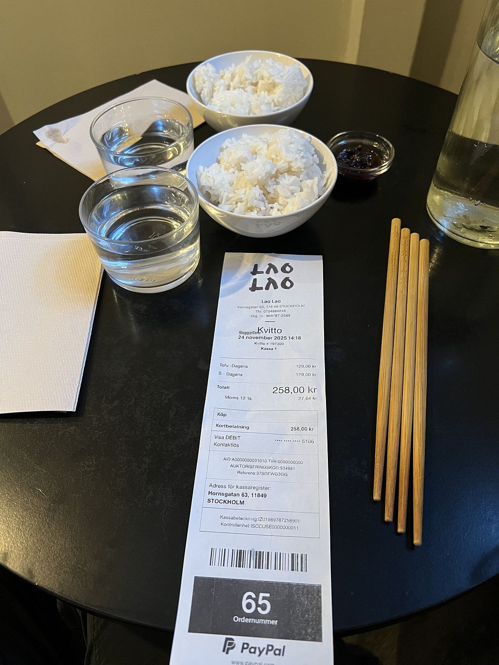 This place has been a recent discovery for me, but all three times I've visited it it's been pretty damn great. There seems to be just about enough of everything to satisfy every vegan's tastebuds, but I would specifically recommend the eggplant, tofu with shittake and the savoury pancake whose name I have forgotten. At Lao Lao you certainly get good value for your money (especially since you can help yourself to more rice and sauces), and as their only weakness, aside for the fact that they serve animal products, I would point the fact that one can't get a receipt if one pays cash. I thought there was something temporarily wrong with the machine, but no, apparently you must pay by card in order to get a receipt. It shouldn't be that way, that customers are either forced to "go with the flow" and embrace the cashless vision, which is insanely pervasive in Sweden, or no taxes will be paid for the transaction, apparently.