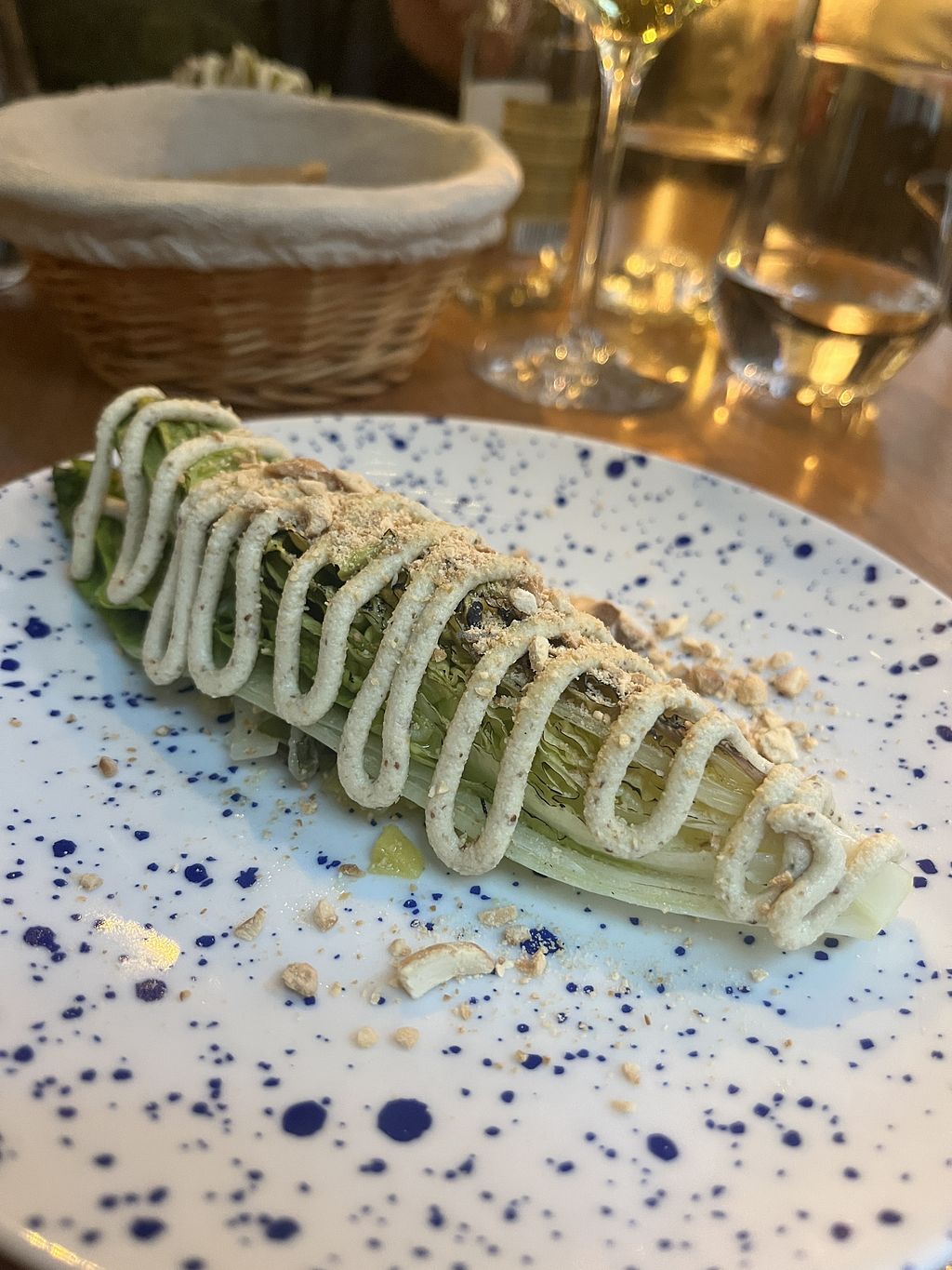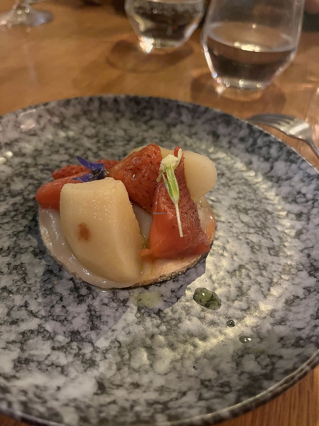 Read moreFinalement nous avons été très déçus, au regard du prix notamment (49 euros pour 4 plats : 2 entrées, plat, dessert) et les vins au verre jusqu'à 11 euros. Les entrées étaient toutes les 2 liquides et trop "recherchées" en oubliant toute gourmandise. On tombe dans le cliché "mangeur de salade" sans couleur. Un plat principal en revanche très réussi à base de chou-fleur rôti. Et une grande part de gâteau chocolat champignons : dommage pour la portion généreuse qu’on aurait souhaité sur les autres plats. Nous sommes sortis sur notre faim et les poches un peu vides.