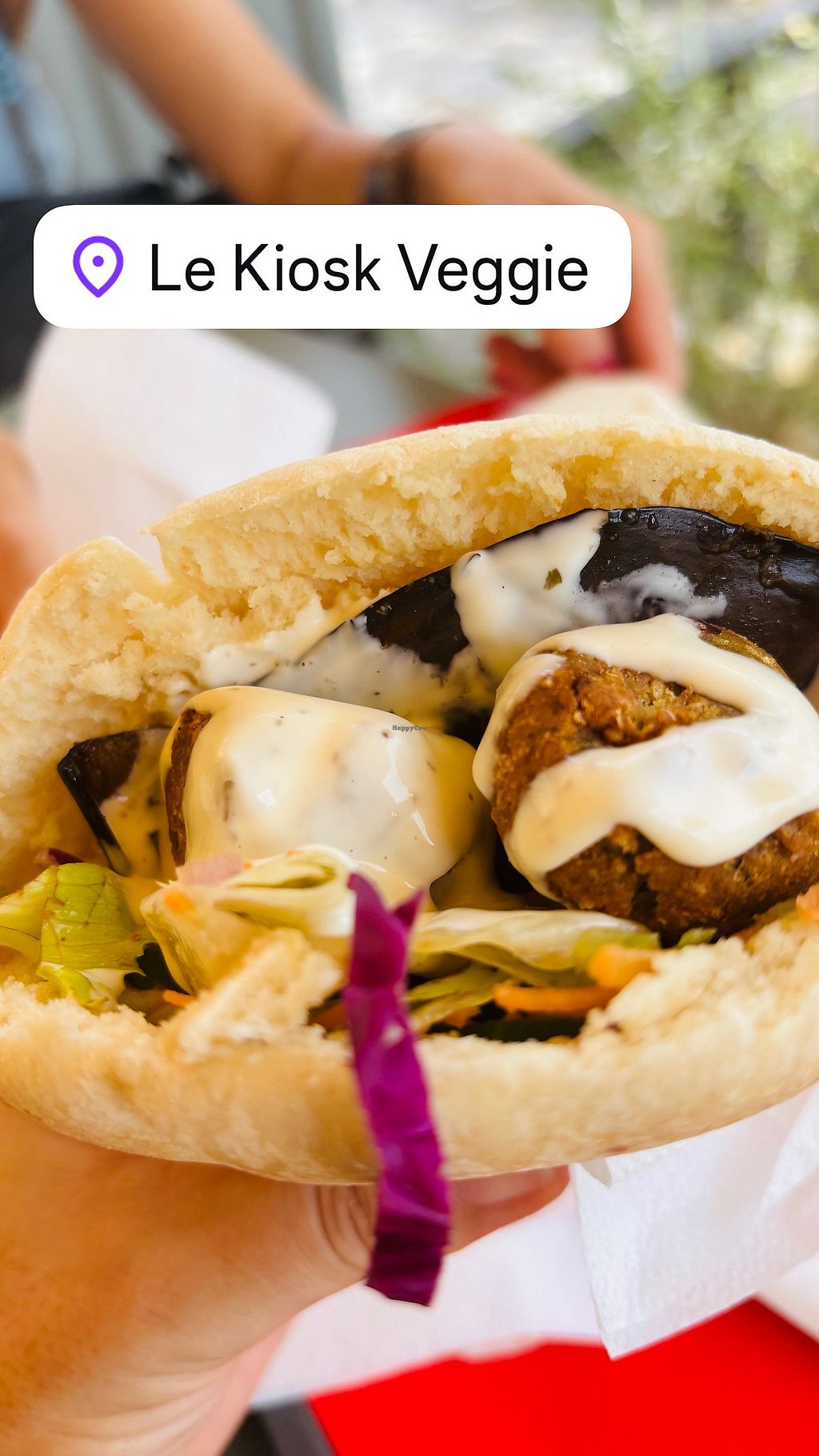 Vegetarian street food kiosk at Place Castellane with outdoor seating. Offers a variety of Mediterranean-inspired fast food. Vegan options are clearly distinguished and include 'Panisses' (traditional Marseille chickpea fries), vegetable nuggets, and the 'Pita du Kiosk' filled with falafel, grilled eggplant, and hummus. Select salads are also vegan, such as the black rice bowl with avocado and adzuki beans. Note that some items, like the Italian sandwich, contain dairy cheese. Drinks include fresh fruit smoothies and homemade lemonade. Open Mon-Sat 08:30-20:00.
