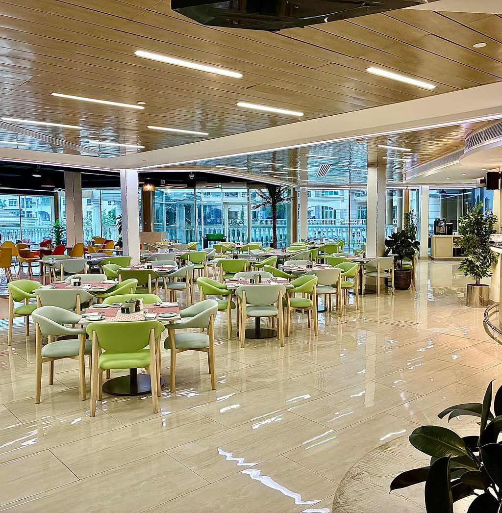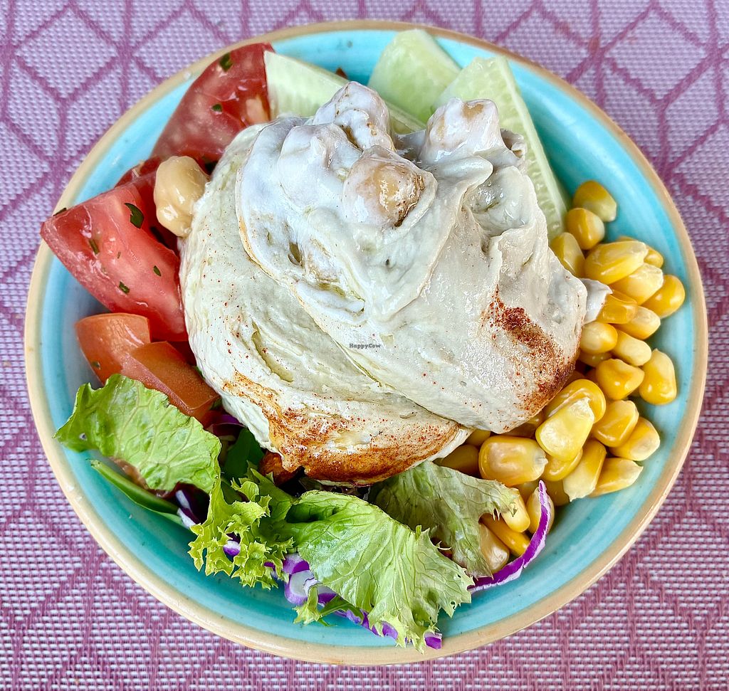 Serves meat, vegan options available. International cuisine restaurant within the Swissotel Al Murooj Hotel, offering both buffet and à la carte dining with clearly labeled vegan items and allergens. Vegan options from the buffet include fresh fruit, a salad bar, and herb roasted potatoes, alongside cultural dishes such as tomato barley (a soup or side), the South Indian porridges Upma (made with semolina) and Vermicelli Upma (made with thin noodles), Indian fritters called Bhaji, the rice and lentil dish Khichdi, Poha (flattened rice), the Middle Eastern oil-cured eggplants called Makdous, and the fava bean stew Ful Medames, plus vegetable fried rice, baked beans, breads, and condiments. Open Mon-Sun 2:00am-6:30am.