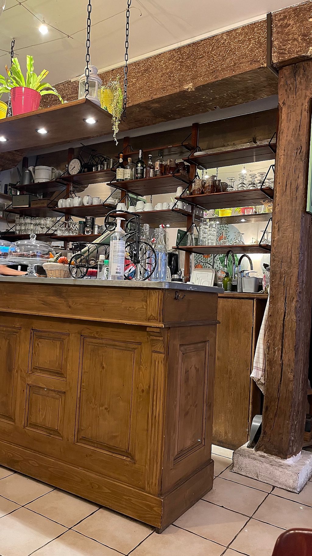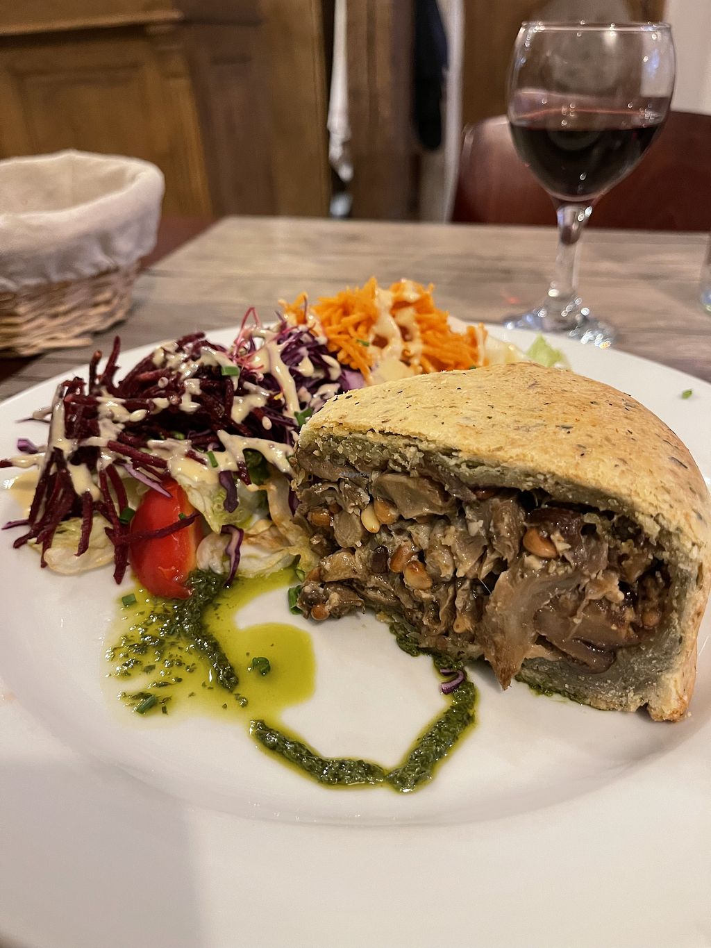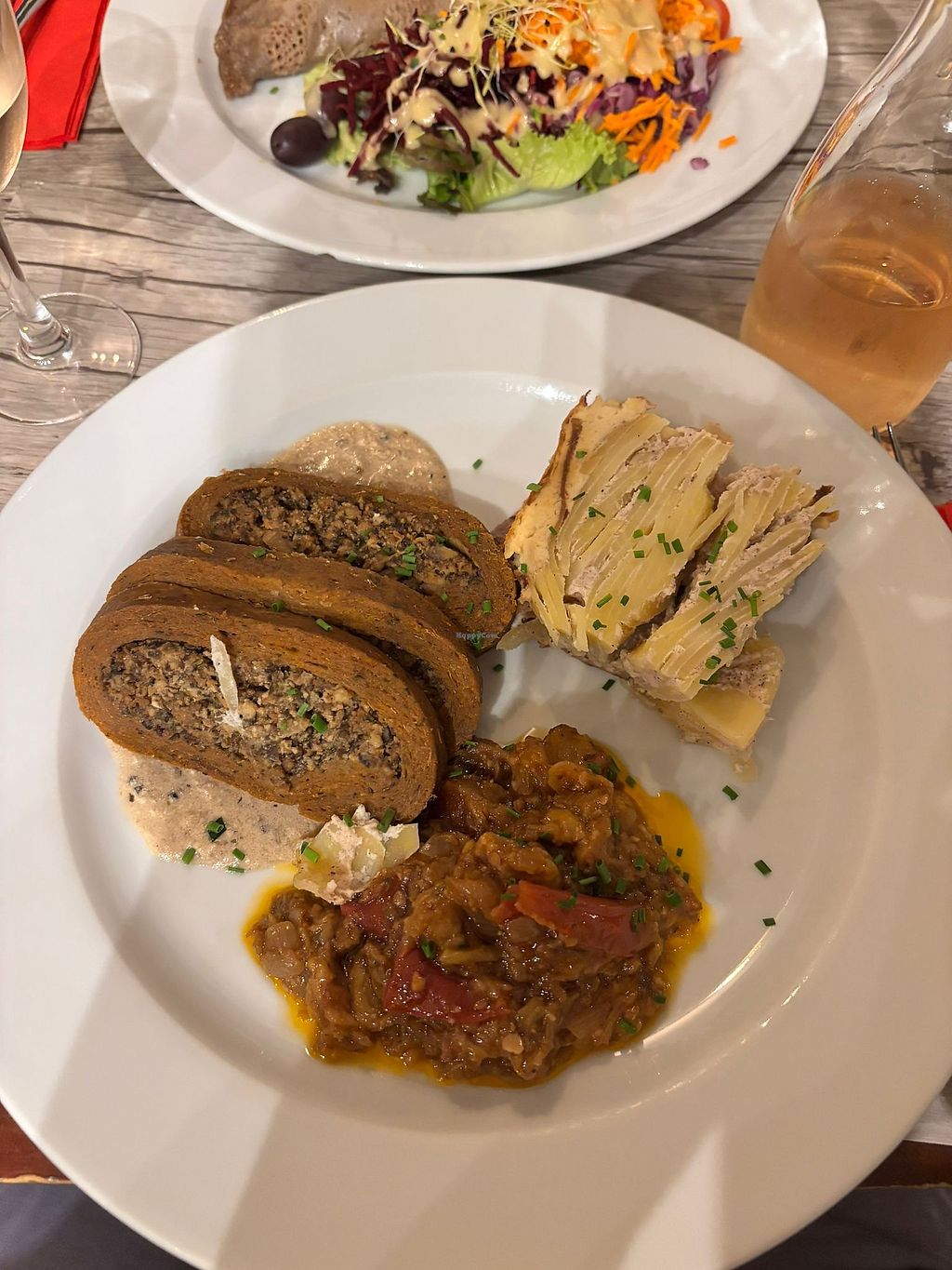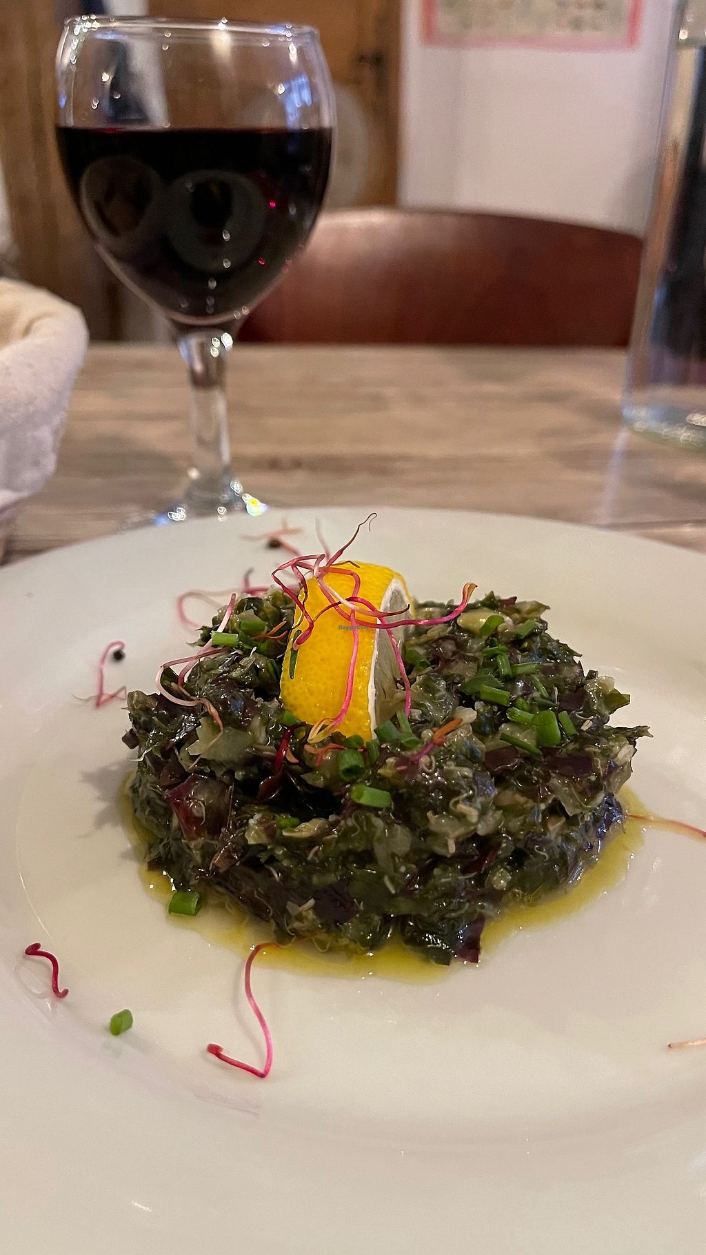 My starter of Tartare d’algues was outstanding, so much so l wouldn’t let them clear till l had finished every scrap. Followed by Tourte aux pleurotes et pignons s/pistou et crudités, very savoury and delicious. Complemented by the house Rhône, mellow and rich. Charming service, very reasonable prices, lovely ambiance.