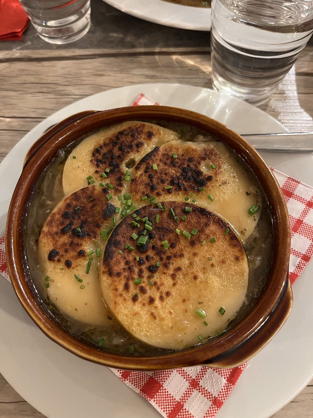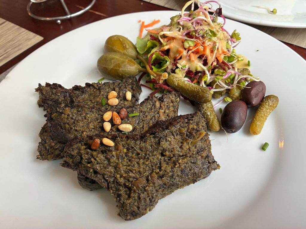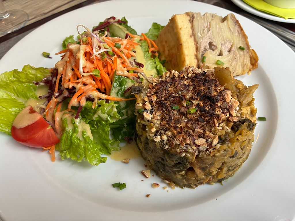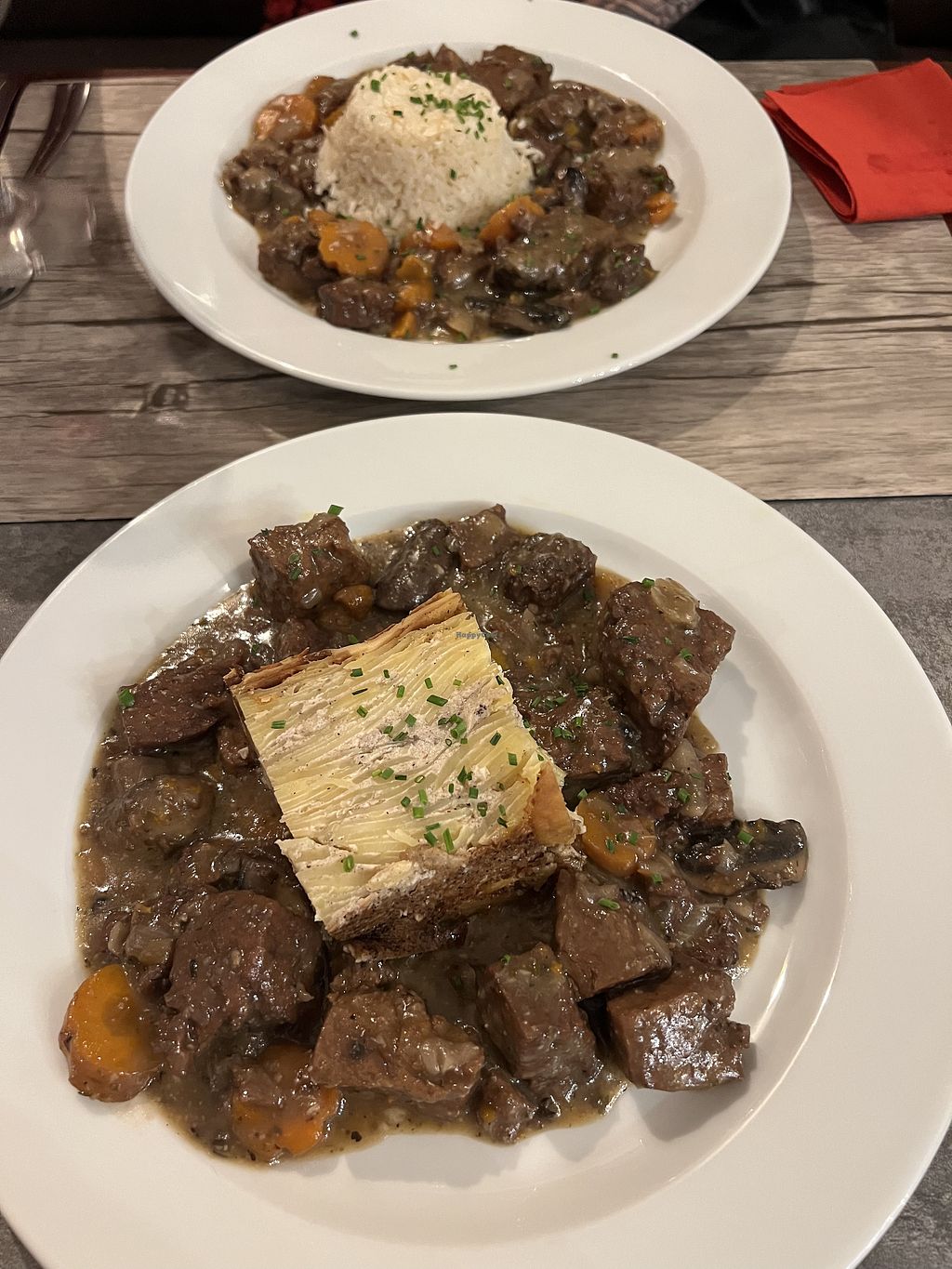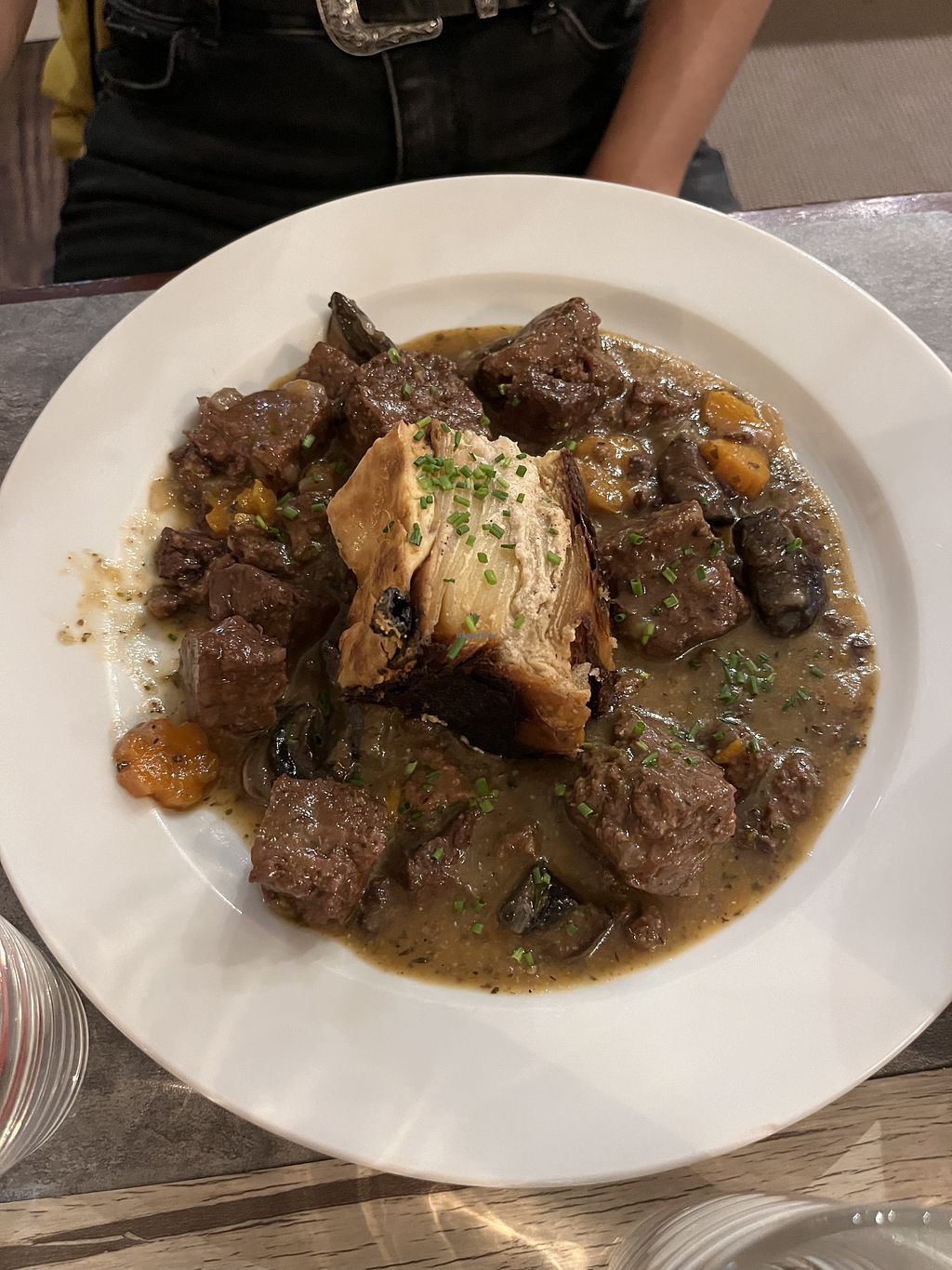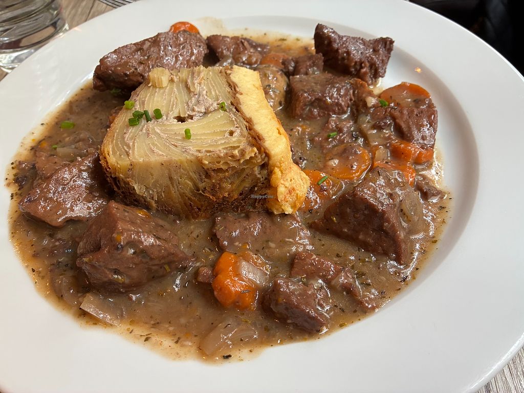 Seitan Bourguignon with potatoes, potato with tapenade, watercress sou…