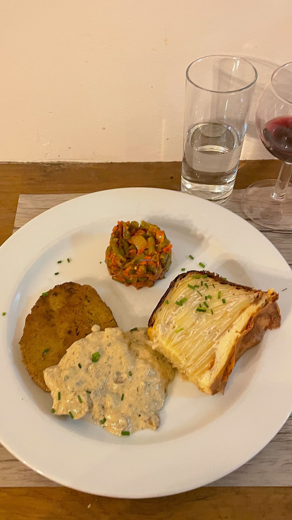 I loved the baked French onion soup and mushroom pate a lot. I had the seitan breast with vegetable and gratin potatoes as a main. I did find it to be too salty and a bit dry for my tastes so taking a star for that.