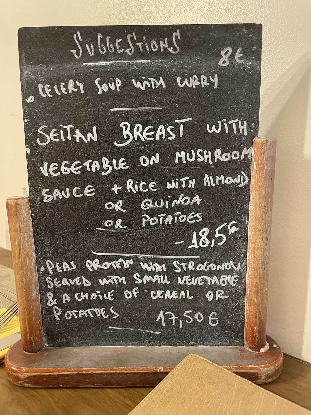 We booked a table and it seems advisable. They have two sittings at night. I ordered a French onion soup for an entree which I’d been looking forward to. This was absolutely delicious. Everything I’d imagined when I looked at the menu before hand. I also had a cider which I enjoyed. For my main plate I had seitan with mushrooms. I opted to have Thai served with potato. The potato itself was also delicious. I’m not sure what it was mixed with but it had so much flavour. I liked the seitan too. I had a hot chocolate as I couldn’t manage dessert. This was really nice and strong. My partner enjoyed his food too. This is one of my favourite dining experiences in Paris ever