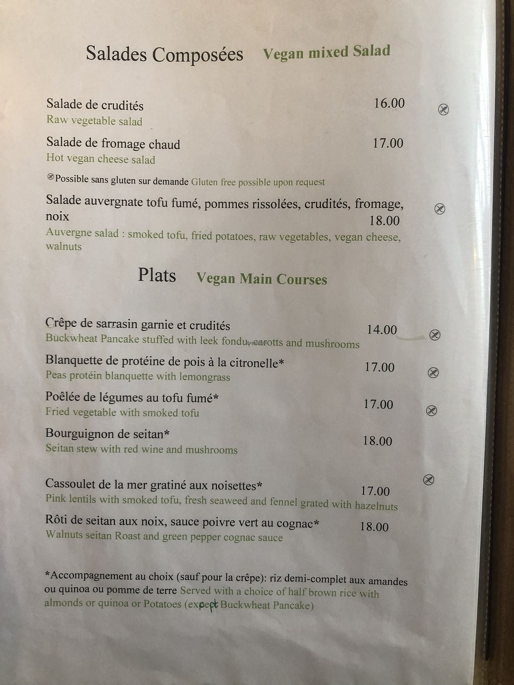 There's a large selection of veganised french dishes. The staff is helpful. I paid € 27.- for a starter and a main dish, which I think is a fair price for a filling and delicous meal in a friendly enviroment.