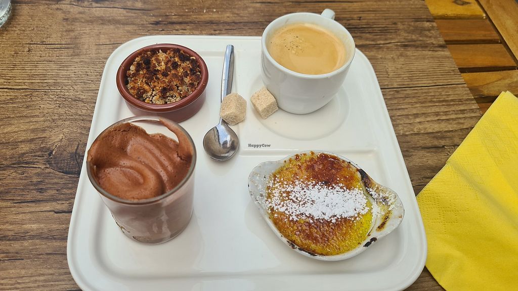 The apples of the tarte tatin were perfect, but the pastry needs work. The creme brulee was crumbly and inedible, and when we mentioned it to the server he claimed we didn't know vegan food or traditional creme brulee and that it was perfect despite the weird flavour and texture.