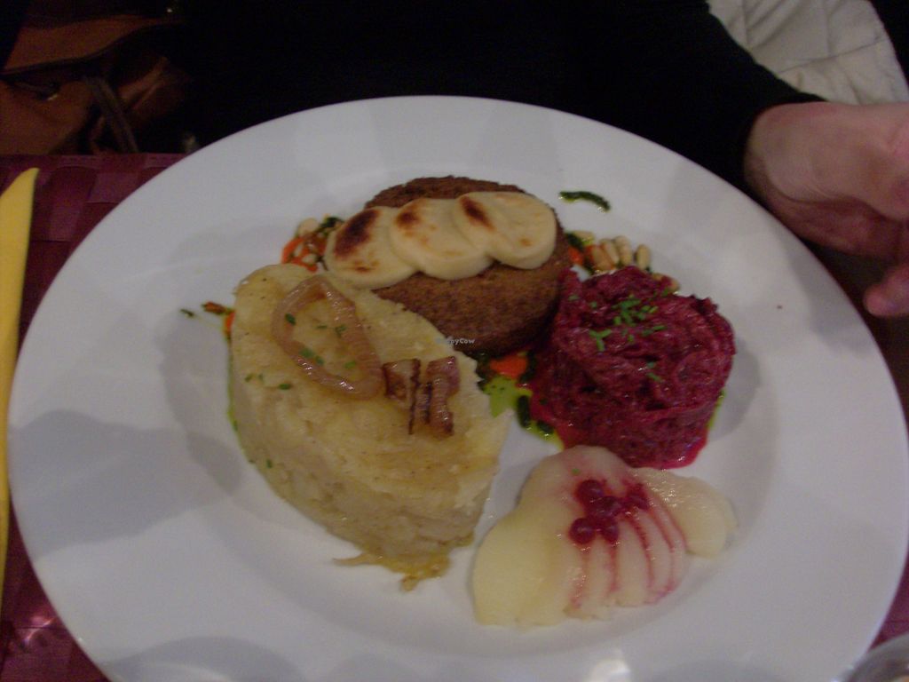I was hovering between three and four stars. The food was fine but certainly nothing special. My starter was a weird boiled potato with some olive tapenade on top. My main was seitan stew, which was ok but not as nice as my homemade version. One of the two waitresses was really grumpy and clearly didn't want to be there.