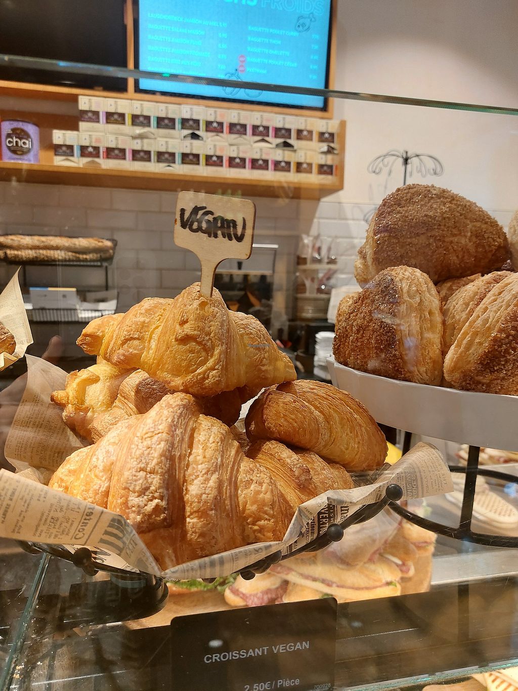 Tem algumas opções vegan que estão assinaladas. Já experimentei o pain au chocolate, o croissant simples e a sandes de panado e estava tudo muito bom.