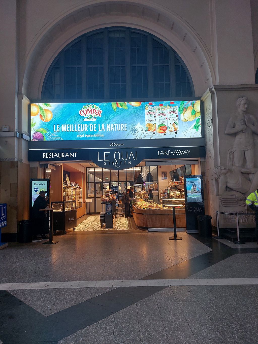 Serves sandwiches and pastries. The vegan croissant and the pain au chocolate had signs "vegan". There was also a vegan ciabatta (mentioned on the signs and on the screen). There was a meal section, so maybe it has something vegan. Great way to start or finish a train ride. No seating though.