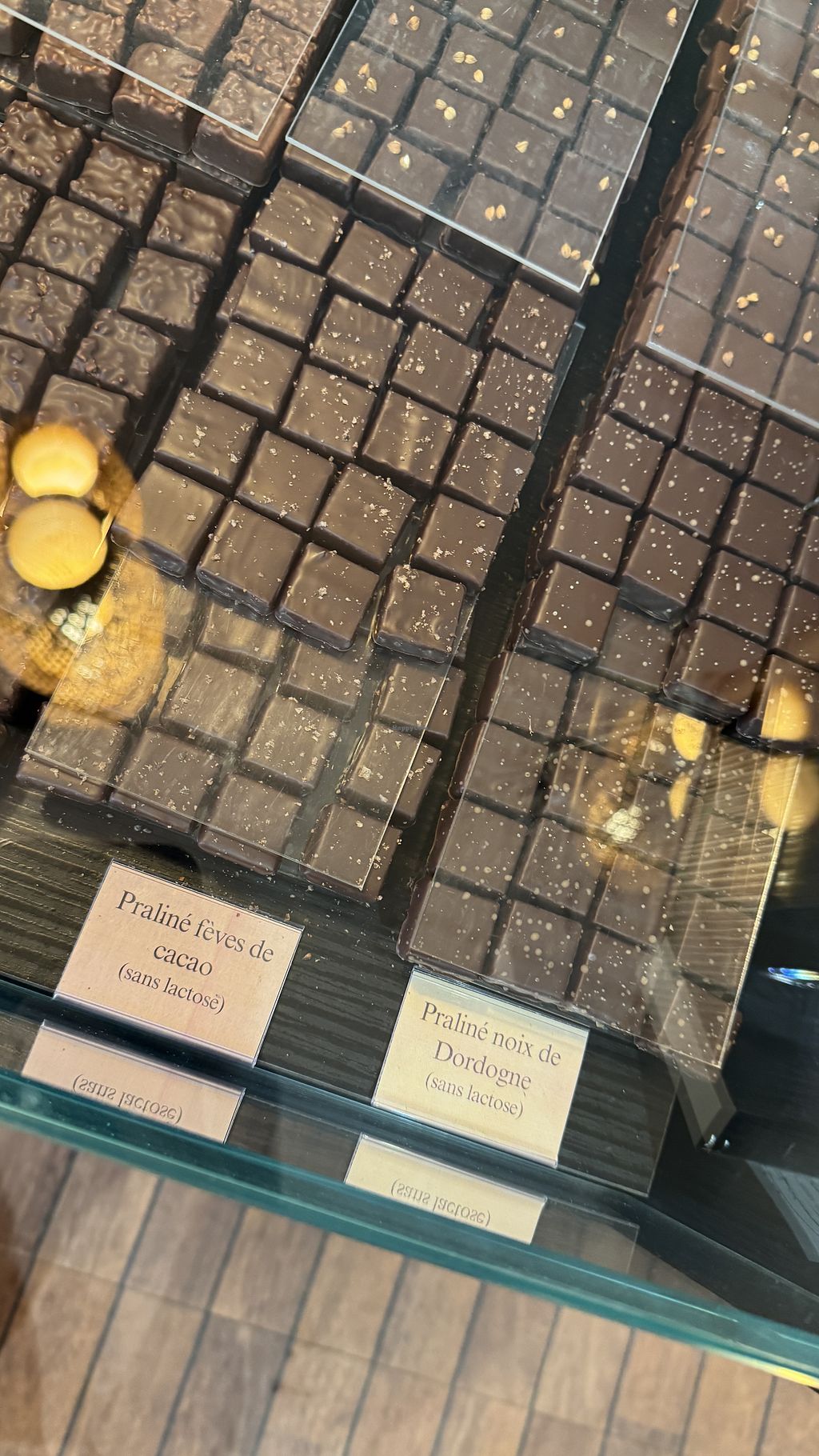 Chocolatier proposant plusieurs pralines sans lactose, et une tablette de chocolat au lait végétalienne.
