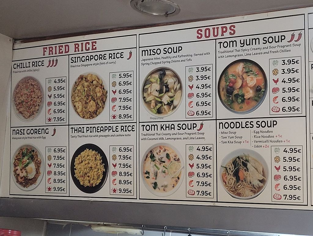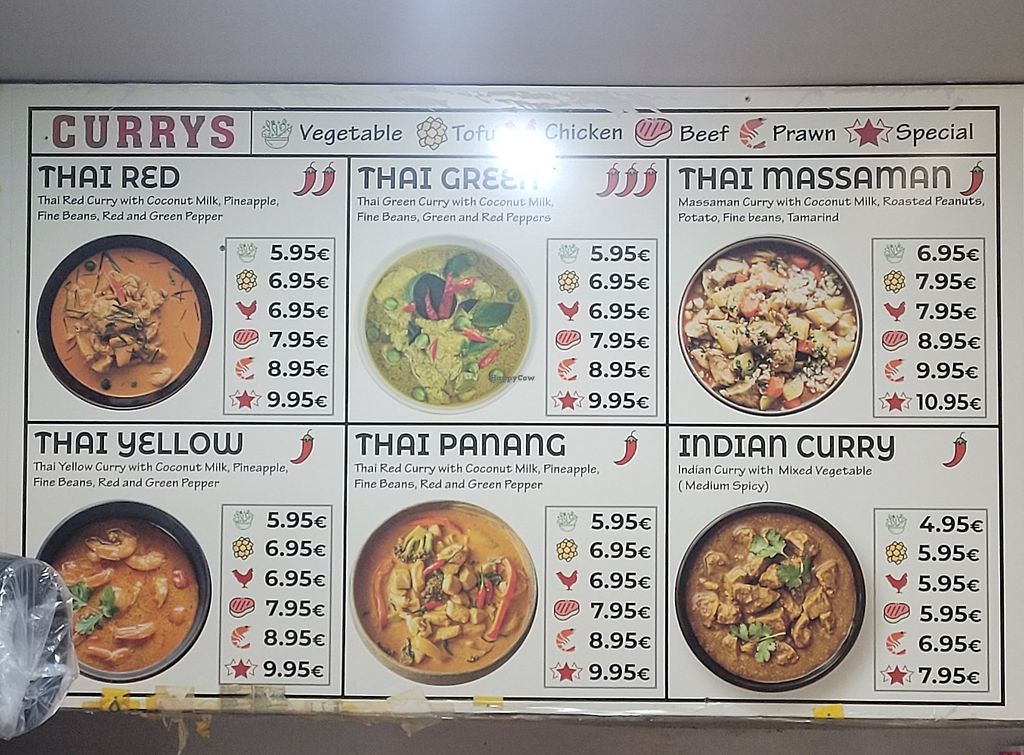 Amazing all the thai food ans some indian too. Most dishes can be selectos vegan. I attach pictures of the menu. Is cheap. To take away but you can seat outside in a shadow in a long bench.