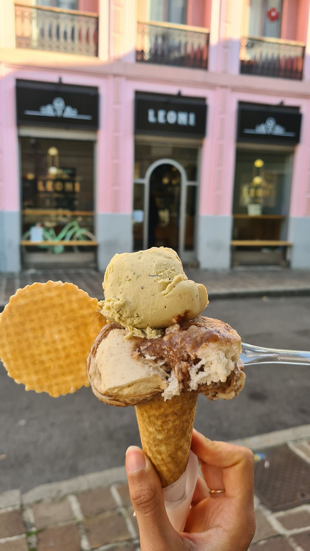 An ice cream shop offers ice creams such as banana chocolate, pear chocolate, pistachio, dark chocolate and fruity, some of which are vegan. Open Mon-Sun 11:00-00:30.