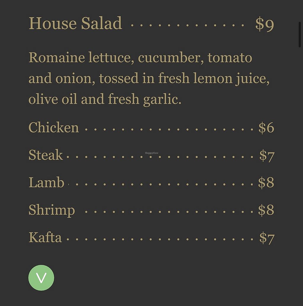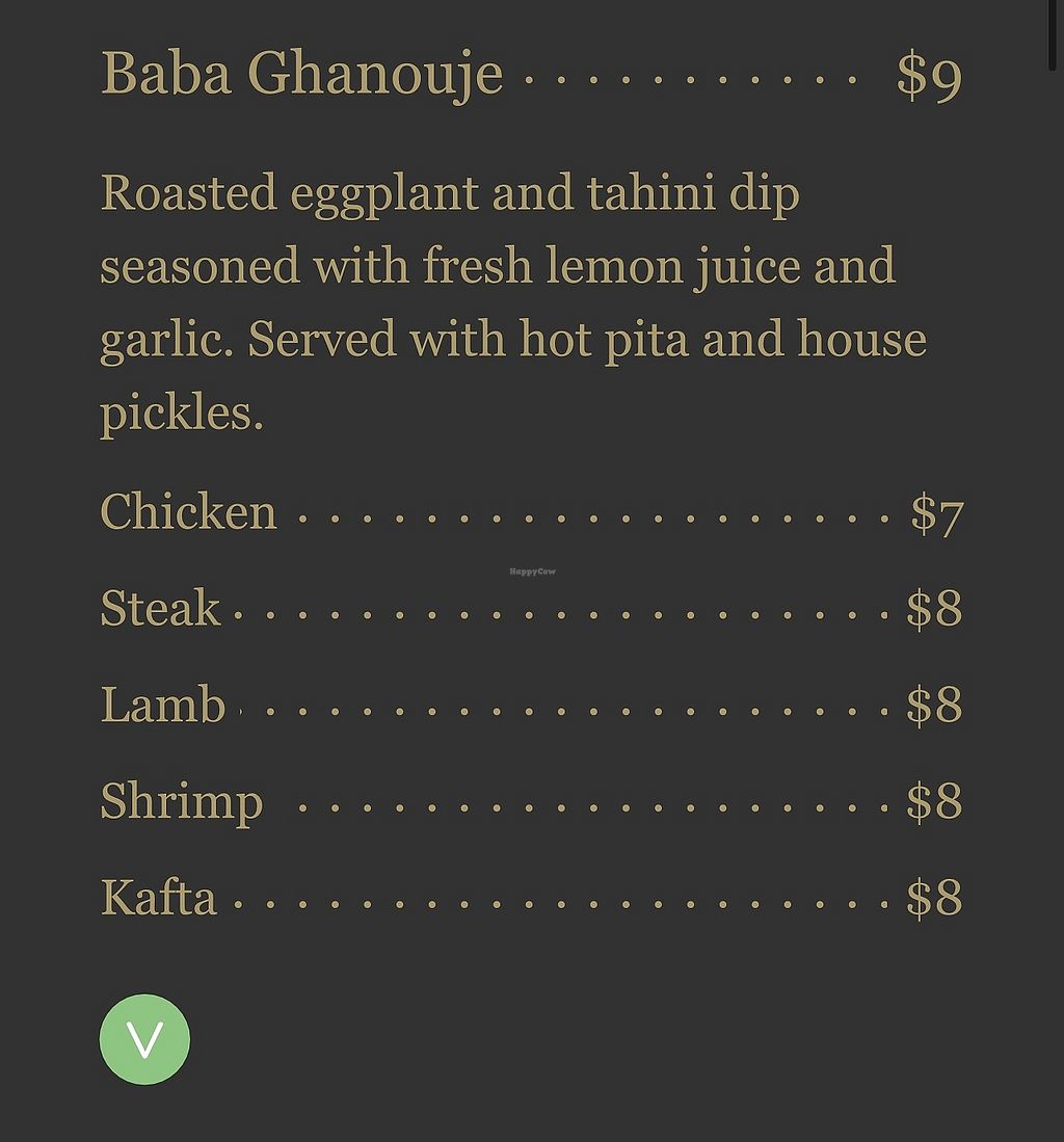 Serves meat, vegan options available. Mediterranean/Middle Eastern food. Vegan marked on the menu, and staff can help. Open Mon 11:00am-9:00pm, Tue-Sat 11:00am-10:00pm, Sun 11:00am-9:00pm.
