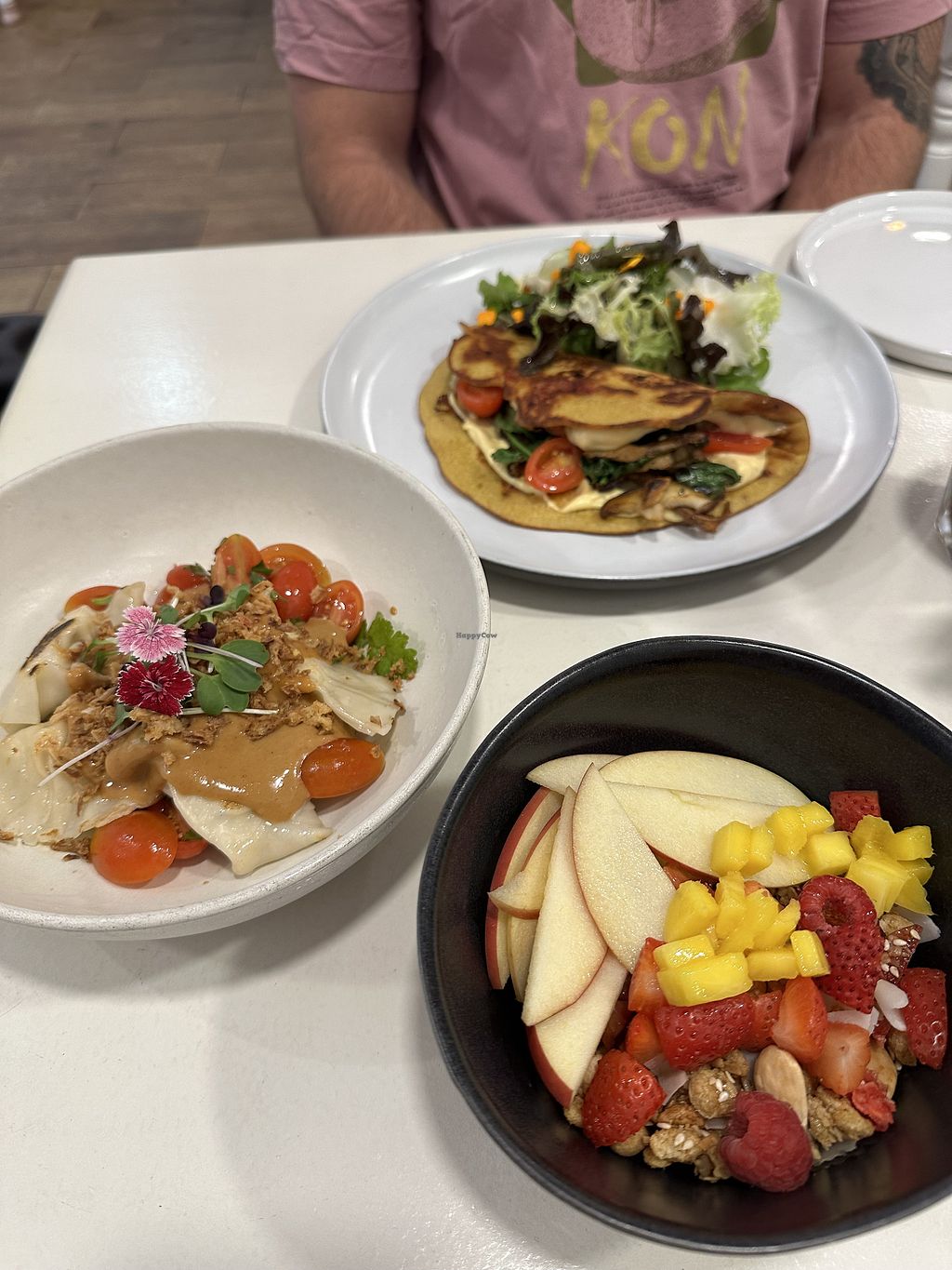 Locations & style was amazing. People were very kind and also helpful in half English/Spanish! Drinks came out fast in cute pink cups. I had the miso eggplant and my partner went with the fruit oat bowl.