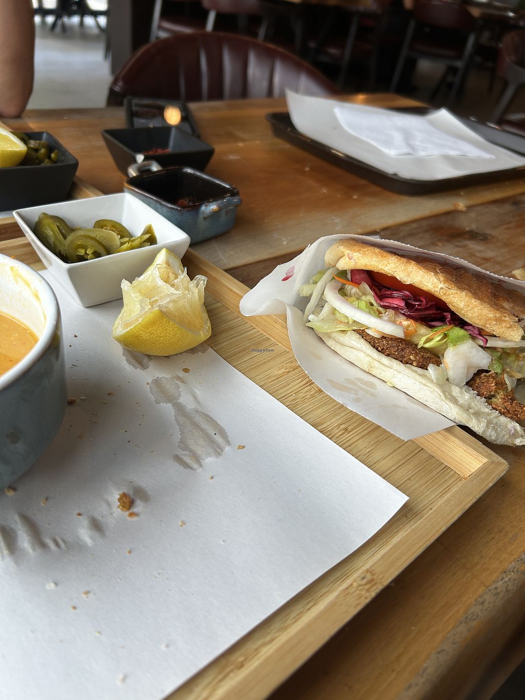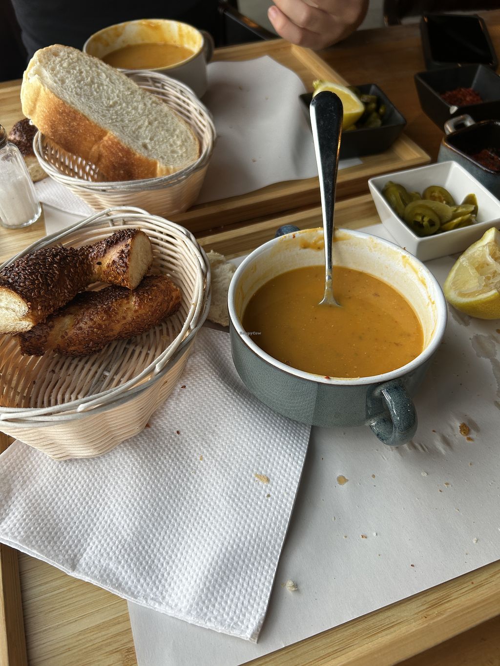 Really good lentil soup, nicely presented with lemon, spicy 🌶️ pepper in in vinegar or powder. Nice simit not to sweet and good falafel, juicy enough